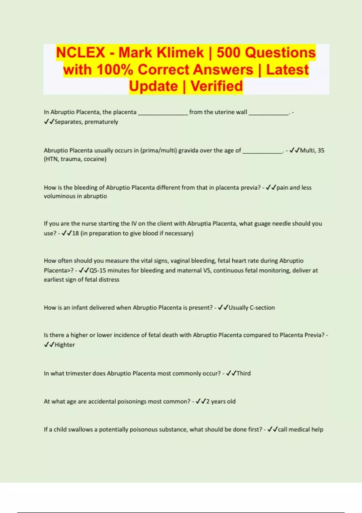 NCLEX - Mark Klimek | 500 Questions with 100% Correct Answers | Latest Update | Verified and Assuared Success