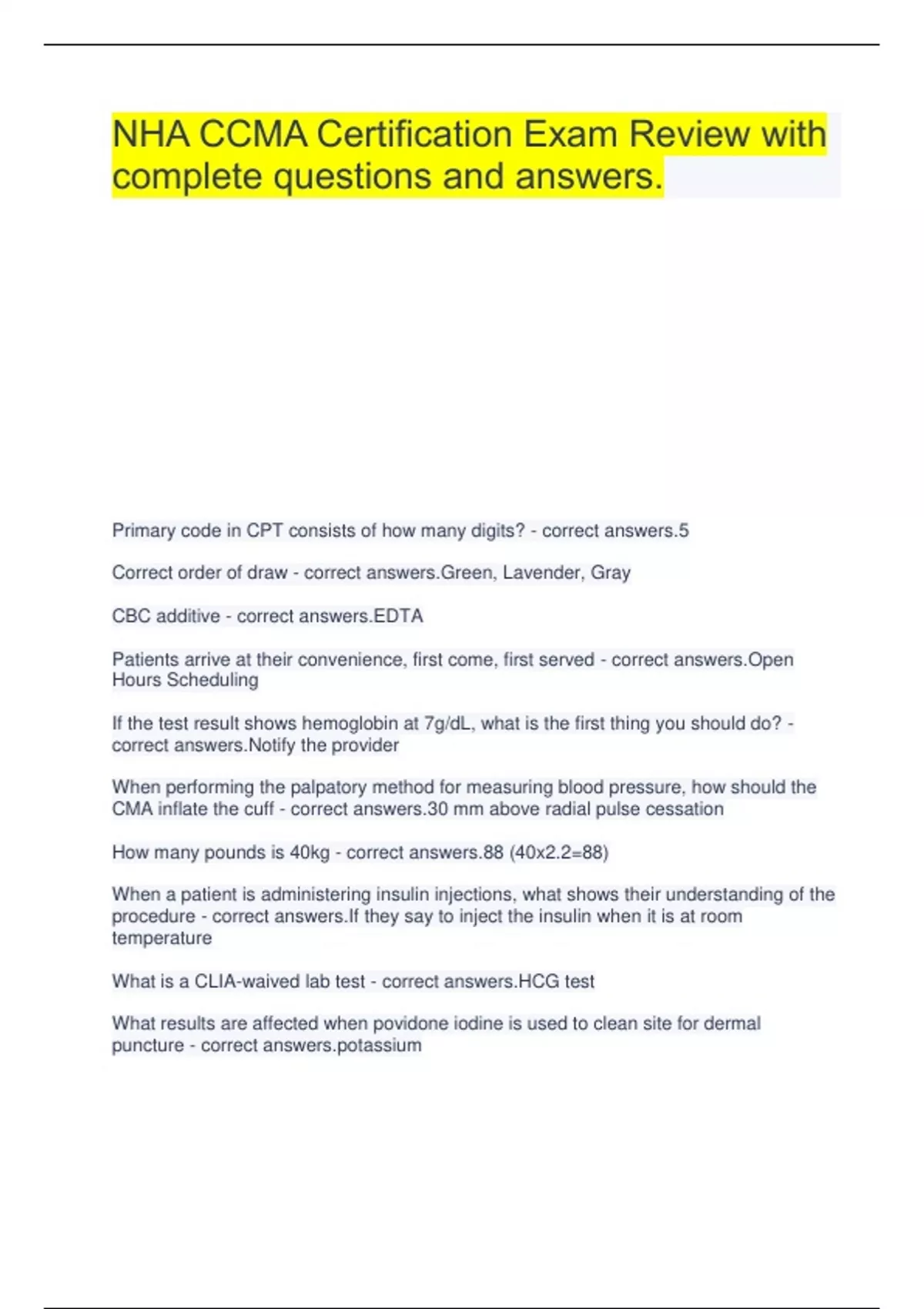 NHA CCMA Certification Exam Review with complete questions and answers. Primary code in CPT consists of how many digits? - correct answers.5 Correct order of draw - correct answers.Green, Lavender, Gray CBC additive - correct answers.EDTA Patients arrive at their convenience, first come, first served - correct answers.Open Hours Scheduling If the test result shows hemoglobin at 7g/dL, what is the first thing you should do? - correct answers.Notify the provider When performing the palpatory method for measuring blood pressure, how should the CMA inflate the cuff - correct answers.30 mm above radial pulse cessation How many pounds is 40kg - correct answers.88 (40x2.2=88) When a patient is administering insulin injections, what shows their understanding of the procedure - correct answers.If they say to inject the insulin when it is at room temperature What is a CLIA-waived lab test - correct answers.HCG test What results are affected when povidone iodine is used to clean site for dermal puncture - correct sium