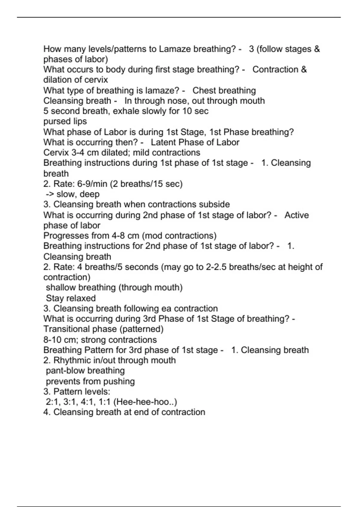 How many levels/patterns to Lamaze breathing? - 3 (follow stages & phases of labor) What occurs to body during first stage breathing? - Contraction & dilation of cervix What type of breathing is lamaze? - Chest breathing Cleansing breath - In through nose, out through mouth 5 second breath, exhale slowly for 10 sec pursed lips What phase of Labor is during 1st Stage, 1st Phase breathing? What is occurring then? - Latent Phase of Labor Cervix 3-4 cm dilated; mild contractions Breathing instructions during 1st phase of 1st stage - 1. Cleansing breath 2. Rate: 6-9/min (2 breaths/15 sec) -> slow, deep 3. Cleansing breath when contractions subside What is occurring during 2nd phase of 1st stage of labor? - Active phase of labor Progresses from 4-8 cm (mod contractions) Breathing instructions for 2nd phase of 1st stage of labor? - 1. Cleansing breath 2. Rate: 4 breaths/5 seconds (may go to 2-2.5 breaths/sec at height of contraction) shallow breathing (through mouth) Stay relaxed 3. Cleansing breath following ea contraction What is occurring during 3rd Phase of 1st Stage of breathing? - Transitional phase (patterned) 8-10 cm; strong contractions Breathing Pattern for 3rd phase of 1st stage - 1. Cleansing breath 2. Rhythmic in/out through mouth pant-blow breathing prevents from pushing 3. Pattern levels: 2:1, 3:1, 4:1, 1:1 (Hee-hee-hoo..) 4. Cleansing breath at end of contraction