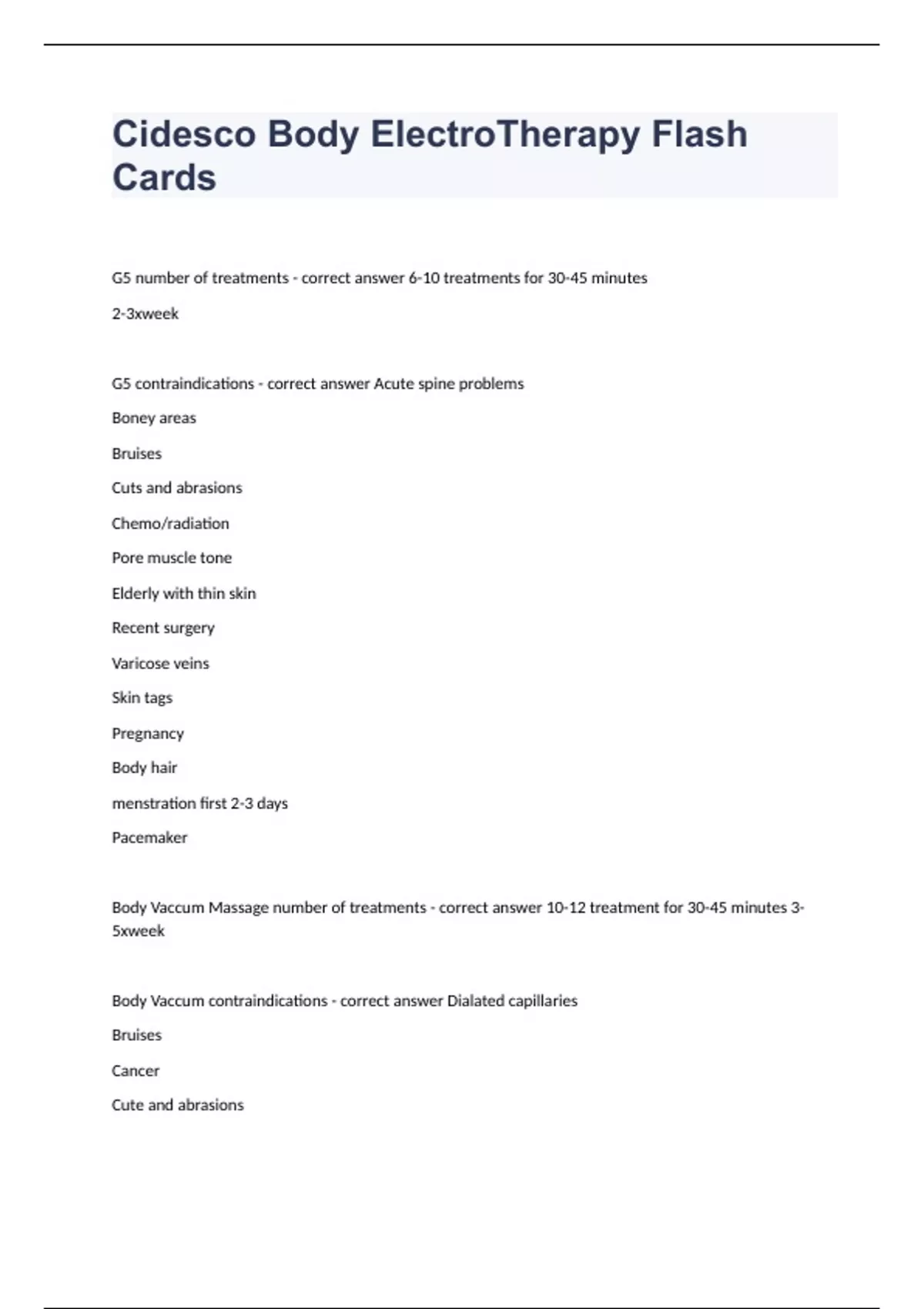 Cidesco Body ElectroTherapy Flash Cards Question and answers 100% correct 2023/2024 G5 number of treatments - correct answer 6-10 treatments for 30-45 minutes 2-3xweek G5 contraindications - correct answer Acute spine problems Boney areas Bruises Cuts and abrasions Chemo/radiation Pore muscle tone