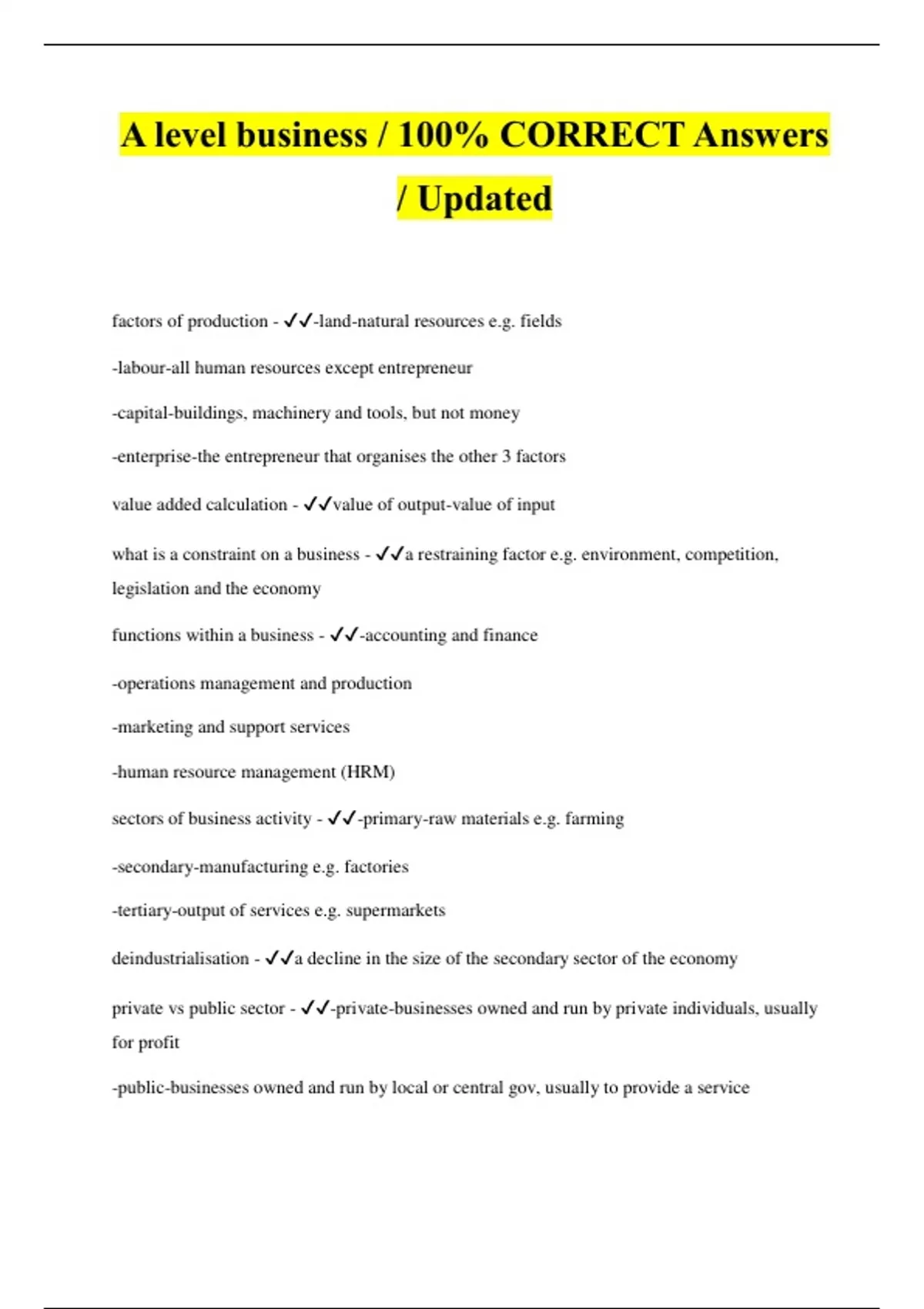 factors of production - -land-natural resources e.g. fields -labour-all human resources except entrepreneur -capital-buildings, machinery and tools, but not money -enterprise-the entrepreneur that organises the other 3 factors value added calculation - value of output-value of input what is a constraint on a business - a restraining factor e.g. environment, competition, legislation and the economy functions within a business - -accounting and finance -operations management and production -marketing and support services -human resource management (HRM) sectors of business activity - -primary-raw materials e.g. farming -secondary-manufacturing e.g. factories -tertiary-output of services e.g. supermarkets deindustrialisation - a decline in the size of the secondary sector of the economy private vs public sector - -private-businesses owned and run by private individuals, usually for profit -public-businesses owned and run by local or central gov, usually to provide a service