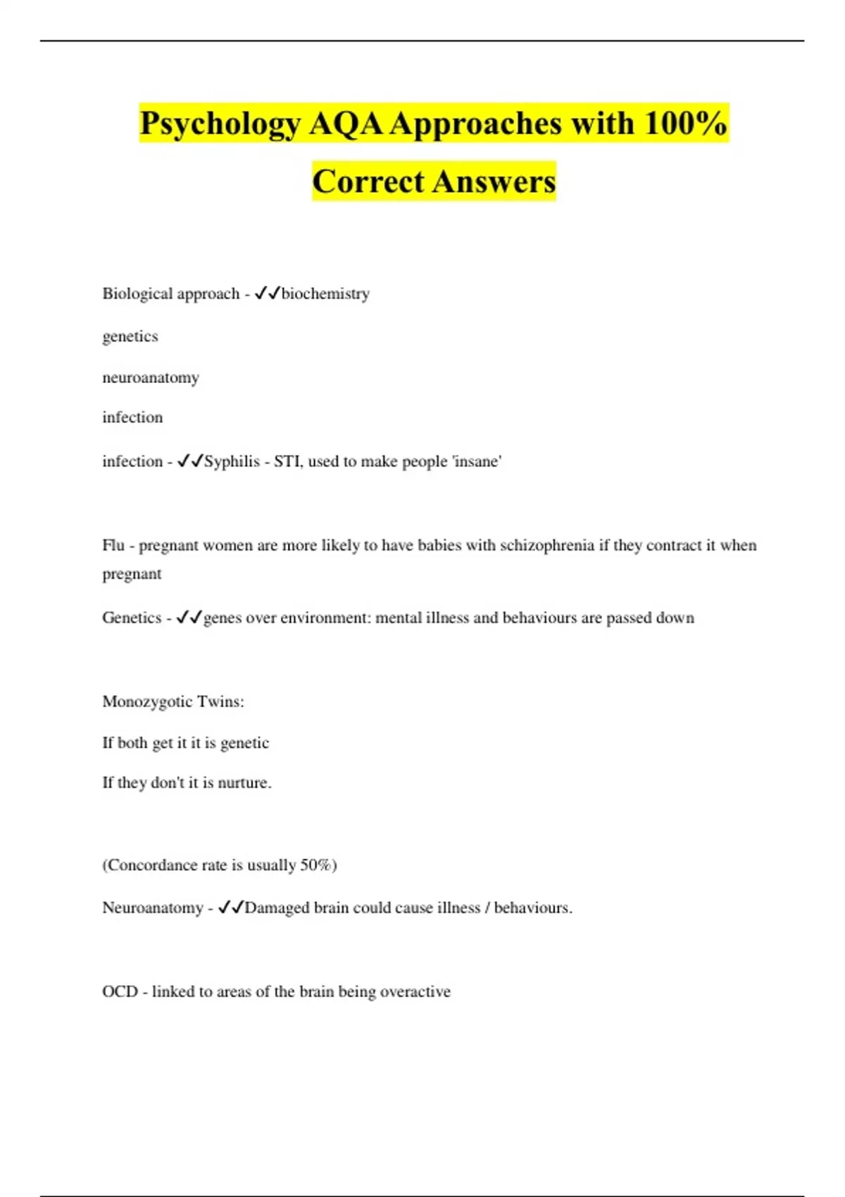 Biological approach - biochemistry genetics neuroanatomy infection infection - Syphilis - STI, used to make people 'insane' Flu - pregnant women are more likely to have babies with schizophrenia if they contract it when pregnant Genetics - genes over environment: mental illness and behaviours are passed down Monozygotic Twins: If both get it it is genetic If they don't it is nurture. (Concordance rate is usually 50%) Neuroanatomy - Damaged brain could cause illness / behaviours. OCD - linked to areas of the brain being overactive