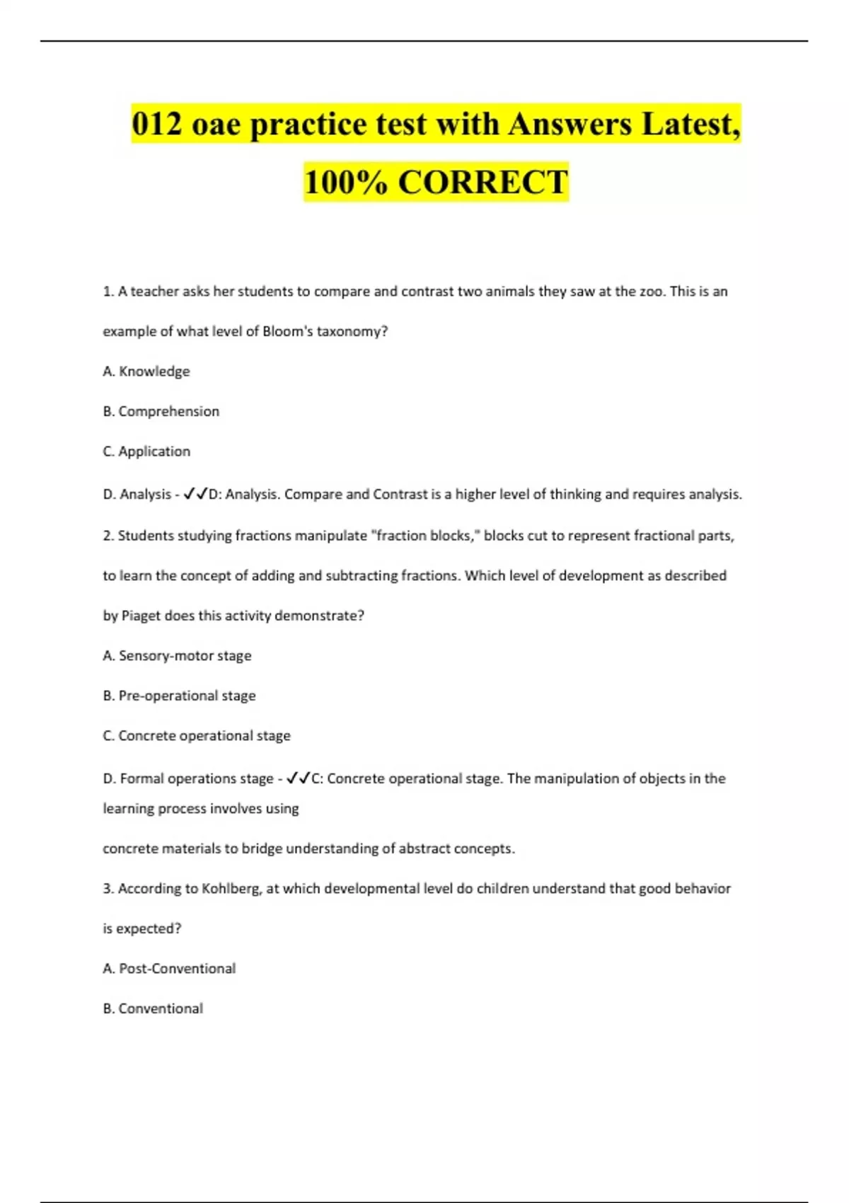1. A teacher asks her students to compare and contrast two animals they saw at the zoo. This is an example of what level of Bloom's taxonomy? A. Knowledge B. Comprehension C. Application D. Analysis - D: Analysis. Compare and Contrast is a higher level of thinking and requires analysis. 2. Students studying fractions manipulate "fraction blocks," blocks cut to represent fractional parts, to learn the concept of adding and subtracting fractions. Which level of development as described by Piaget does this activity demonstrate? A. Sensory-motor stage B. Pre-operational stage C. Concrete operational stage D. Formal operations stage - C: Concrete operational stage. The manipulation of objects in the learning process involves using concrete materials to bridge understanding of abstract concepts. 3. According to Kohlberg, at which developmental level do children understand that good behavior is expected? A. Post-Conventional B. Conventional