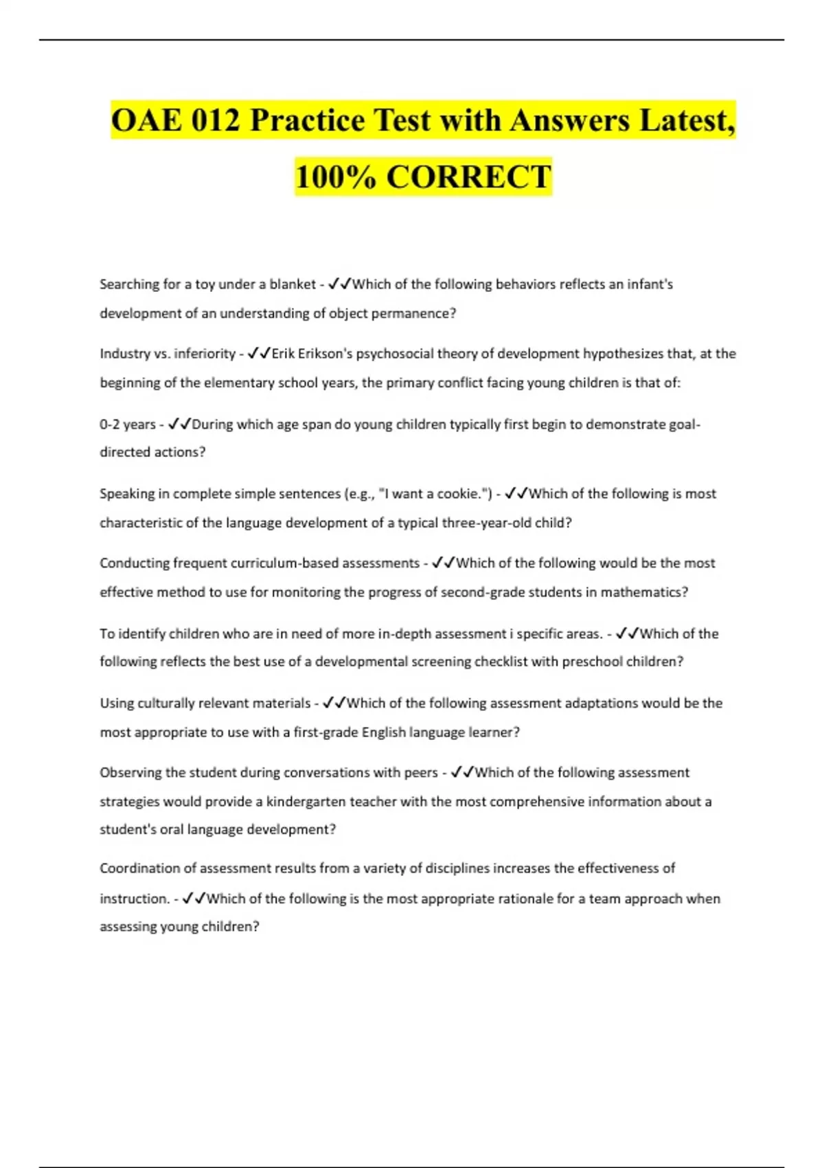 Searching for a toy under a blanket - Which of the following behaviors reflects an infant's development of an understanding of object permanence? Industry vs. inferiority - Erik Erikson's psychosocial theory of development hypothesizes that, at the beginning of the elementary school years, the primary conflict facing young children is that of: 0-2 years - During which age span do young children typically first begin to demonstrate goaldirected actions? Speaking in complete simple sentences (e.g., "I want a cookie.") - Which of the following is most characteristic of the language development of a typical three-year-old child? Conducting frequent curriculum-based assessments - Which of the following would be the most effective method to use for monitoring the progress of second-grade students in mathematics? To identify children who are in need of more in-depth assessment i specific areas. - Which of the following reflects the best use of a developmental screening checklist with preschool children? Using culturally relevant materials - Which of the following assessment adaptations would be the most appropriate to use with a first-grade English language learner?
