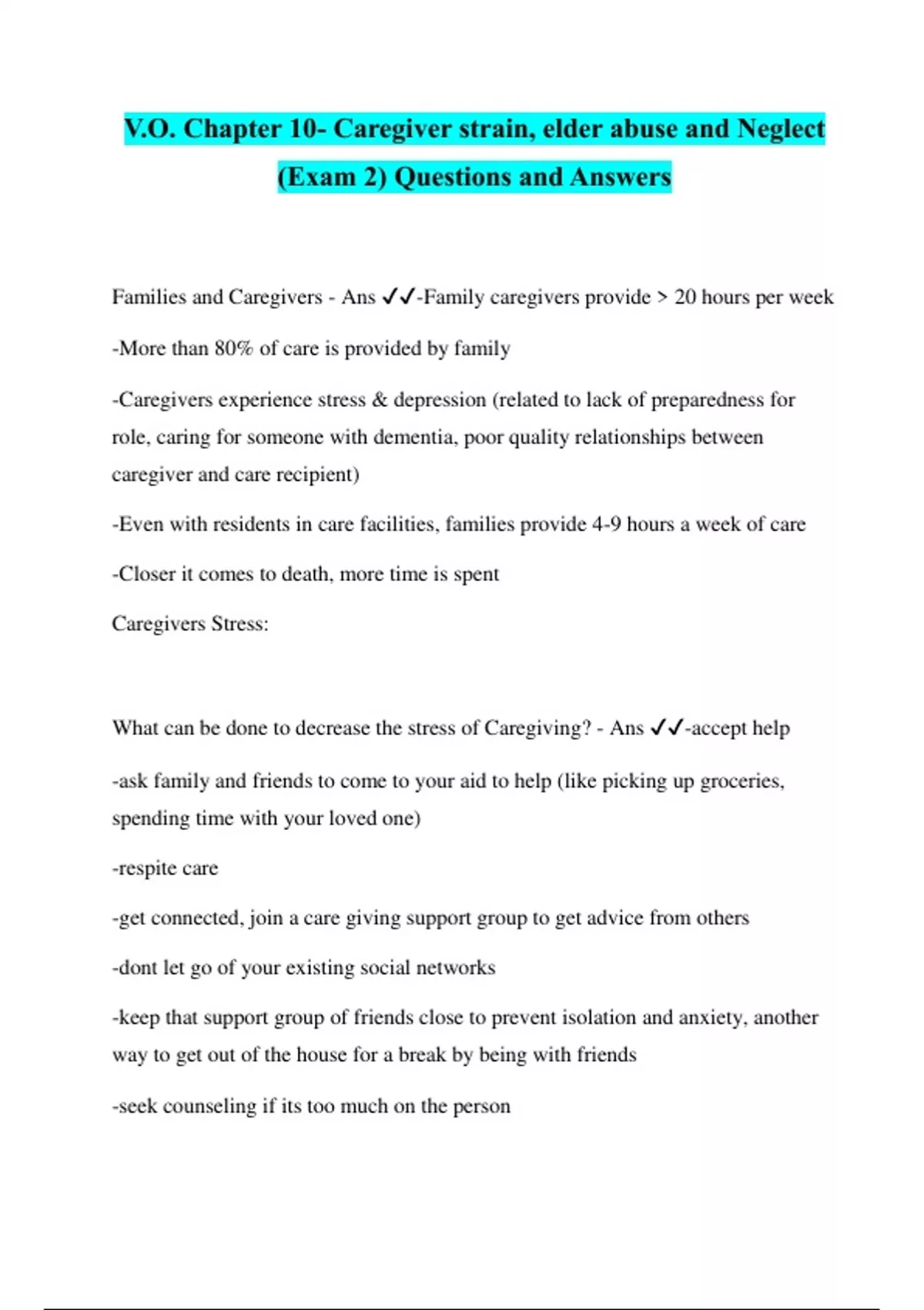 V.O. Chapter 10- Caregiver strain, elder abuse and Neglect (Exam 2) Questions and Answers Families and Caregivers - Ans ️️ -Family caregivers provide > 20 hours per week -More than 80% of care is provided by family -Caregivers experience stress & depression (related to lack of preparedness for role, caring for someone with dementia, poor quality relationships between caregiver and care recipient) -Even with residents in care facilities, families provide 4-9 hours a week of care -Closer it comes to death, more time is spent Caregivers Stress: What can be done to decrease the stress of Caregiving? - Ans ️️ -accept help -ask family and friends to come to your aid to help (like picking up groceries, spending time with your loved one) -respite care -get connected, join a care giving support group to get advice from others -dont let go of your existing social networks -keep that support group of friends close to prevent isolation and anxiety, another way to get out of the house for a break by being with friends -seek counseling if its too much on the person -don't over indulge on sweets or alcohol due to stress -eat healthy and nutritious meals -get enough sleep and exercise Family, Caregivers Strain - Ans ️️ Caregiver Strain Index (CSI) Consult Geri CAREGIVER STRESS TEST: Alzheimer's Association®. Do you regularly: Feel like you have to do it all yourself, and that you should be doing more? o Yes o No Withdraw from family, friends and activities that you used to enjoy? o Yes o No Worry about the safety of the person you care for? o Yes o No Feel anxious about money and health care decisions? o Yes o No Deny the impact of the disease and its effects on your family? o Yes o No Feel grief or sadness that your relationship wit