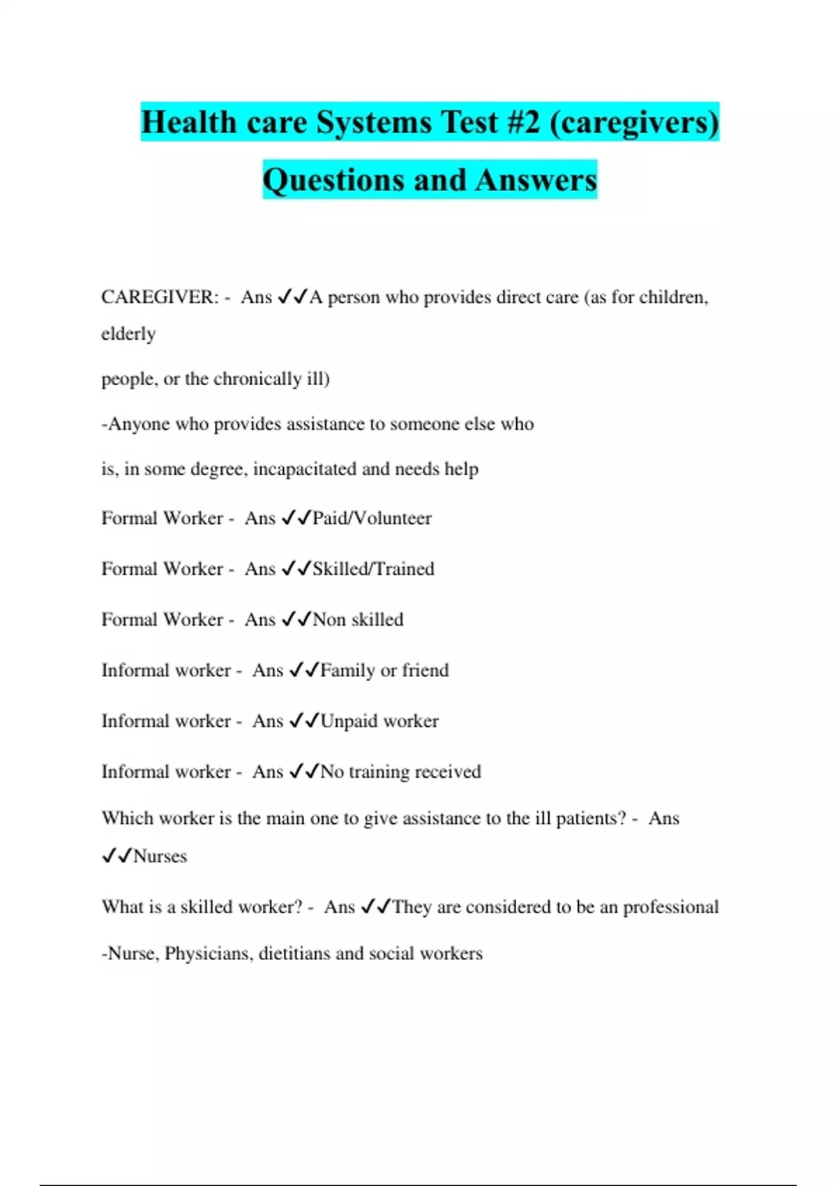 Health care Systems Test #2 (caregivers) Questions and Answers CAREGIVER: - Ans ️️ A person who provides direct care (as for children, elderly people, or the chronically ill) -Anyone who provides assistance to someone else who is, in some degree, incapacitated and needs help Formal Worker - Ans ️️ Paid/Volunteer Formal Worker - Ans ️️ Skilled/Trained Formal Worker - Ans ️️ Non skilled Informal worker - Ans ️️ Family or friend Informal worker - Ans ️️ Unpaid worker Informal worker - Ans ️️ No training received Which worker is the main one to give assistance to the ill patients? - Ans ️️ Nurses What is a skilled worker? - Ans ️️ They are considered to be an professional -Nurse, Physicians, dietitians and social workers