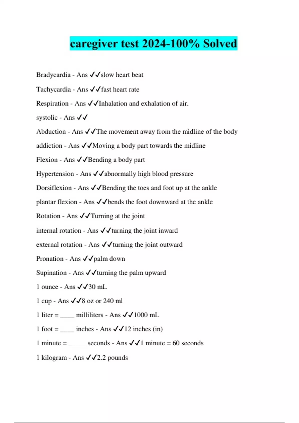 caregiver test 2024-100% Solved Bradycardia - Ans ️️ slow heart beat Tachycardia - Ans ️️ fast heart rate Respiration - Ans ️️ Inhalation and exhalation of air. systolic - Ans ️️ Abduction - Ans ️️ The movement away from the midline of the body addiction - Ans ️️ Moving a body part towards the midline Flexion - Ans ️️ Bending a body part Hypertension - Ans ️️ abnormally high blood pressure Dorsiflexion - Ans ️️ Bending the toes and foot up at the ankle plantar flexion - Ans ️️ bends the foot downward at the ankle Rotation - Ans ️️ Turning at the joint internal rotation - Ans ️️ turning the joint inward external rotation - Ans ️️ turning the joint outward Pronation - Ans ️️ palm down Supination - Ans ️️ turning the palm upward 1 ounce - Ans ️️ 30 mL 1 cup - Ans ️️ 8 oz or 240 ml 1 liter = ____ milliliters - Ans ️️ 1000 mL 1 foot = ____ inches - Ans ️️ 12 inches (in) 1 minute = _____ seconds - Ans ️️ 1 minute = 60 seconds 1 kilogram - Ans ️️ 2.2 pounds