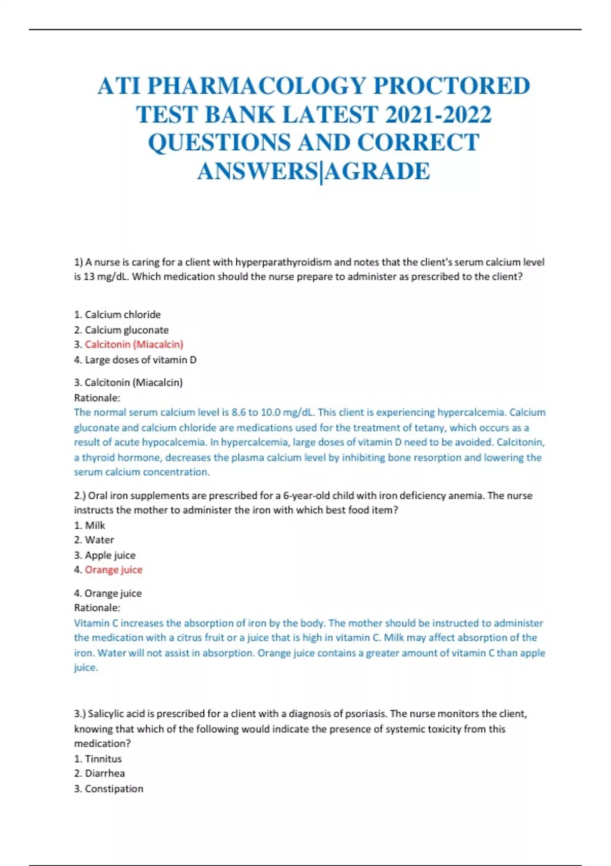 ATI PHARMACOLOGY PROCTORED TEST BANK LATEST QUESTIONS AND CORRECT ANSWERS|AGRADE 1) A nurse is caring for a client with hyperparathyroidism and notes that the client's serum calcium level is 13 mg/dL. Which medication should the nurse prepare to administer as prescribed to the client? 1. Calcium chloride 2. Calcium gluconate 3. Calcitonin (Miacalcin) 4. Large doses of vitamin D 3. Calcitonin (Miacalcin) Rationale: The normal serum calcium level is 8.6 to 10.0 mg/dL. This client is experiencing hypercalcemia. Calcium gluconate and calcium chloride are medications used for the treatment of tetany, which occurs as a result of acute hypocalcemia. In hypercalcemia, large doses of vitamin D need to be avoided. Calcitonin, a thyroid hormone, decreases the plasma calcium level by inhibiting bone resorption and lowering the serum calcium concentration. 2.) Oral iron supplements are prescribed for a 6-year-old child with iron deficiency anemia. The nurse instructs the mother to administer the iron with which best food item? 1. Milk 2. Water 3. Apple juice 4. Orange juice 4. Orange juice Rationale: Vitamin C increases the absorption of iron by the body. The mother should be instructed to administer the medication with a citrus fruit or a juice that is high in vitamin C. Milk may affect absorption of the iron. Water will not assist in absorption. Orange juice contains a greater amount of vitamin C than apple juice. 3.) Salicylic acid is prescribed for a client with a diagnosis of psoriasis. The nurse monitors the client, knowing that which of the following would indicate the presence of systemic toxicity from this medication? 1. Tinnitus 2. Diarrhea 3. Constipation 4. Decreased respirations 1. Tinnitus Rationale: Salicylic acid is absorbed readily through the skin, and systemic toxicity (salicylism) can result. Symptoms include tinnitus, dizziness, hyperpnea, and psychological disturbances. Constipation and diarrhea are not associated with salicylism. 4.) The camp nurse asks the children preparing to swim in the lake if they have applied sunscreen. The nurse reminds the children that chemical sunscreens are most effective when applied: 1. Immediately before swimming 2. 15 minutes before exposure to the sun 3. Immediately before exposure to the sun 4. At least 30 minutes before exposure to the sun 4. At least 30 minutes before exposure to the sun Rationale: Sunscreens are most effective when applied at least 30 minutes before exposure to the sun so that they can penetrate the skin. All sunscreens should be reapplied after swimming