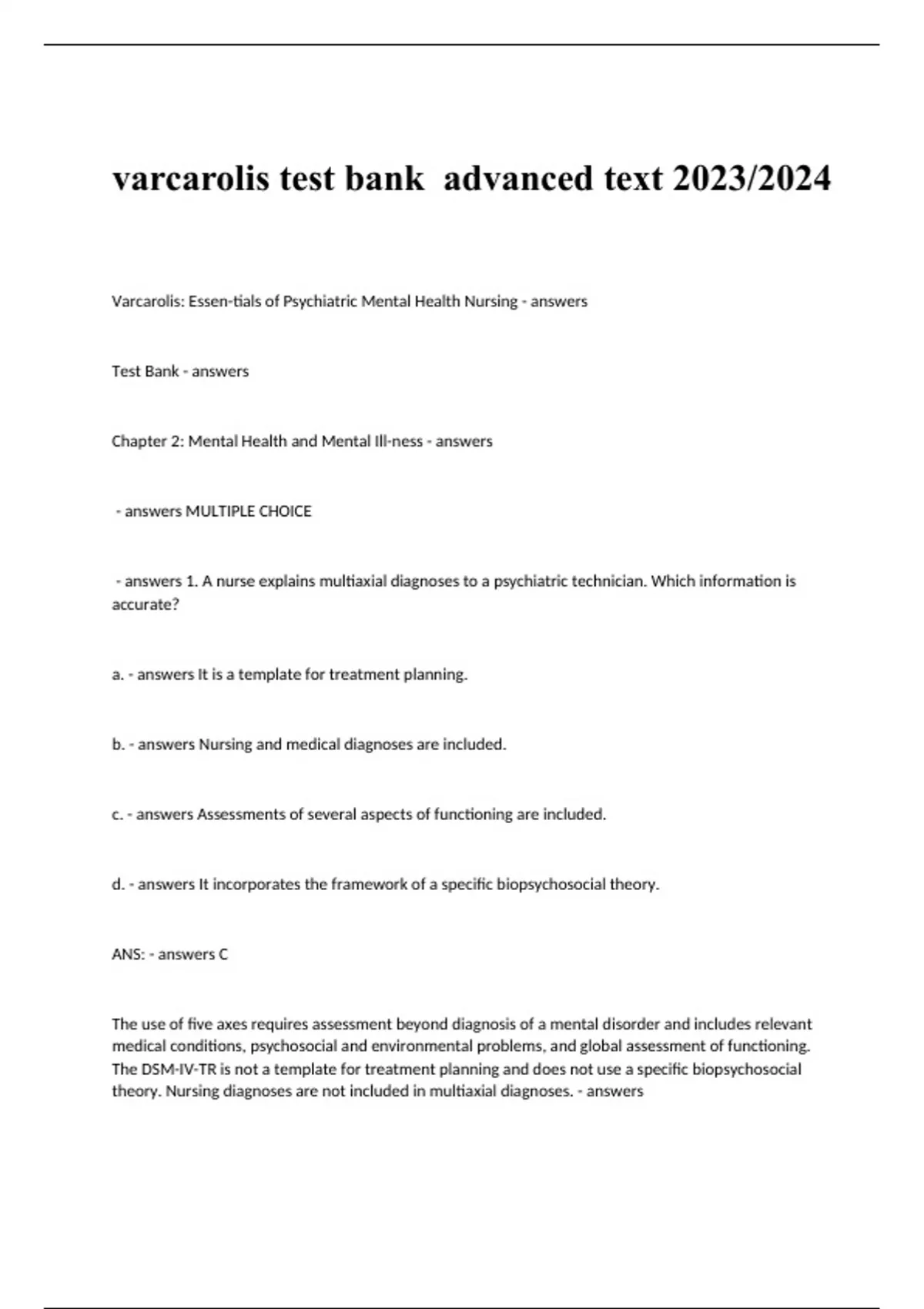 Varcarolis: Essen-tials of Psychiatric Mental Health Nursing - answers Test Bank - answers Chapter 2: Mental Health and Mental Ill-ness - answers - answers MULTIPLE CHOICE - answers 1. A nurse explains multiaxial diagnoses to a psychiatric technician. Which information is accurate? a. - answers It is a template for treatment planning. b. - answers Nursing and medical diagnoses are included. c. - answers Assessments of several aspects of functioning are included. d. - answers It incorporates the framework of a specific biopsychosocial theory. ANS: - answers C The use of five axes requires assessment beyond diagnosis of a mental disorder and includes relevant medical conditions, psychosocial and environmental problems, and global assessment of functioning. The DSM-IV-TR is not a template for treatment planning and does not use a specific biopsychosocial theory. Nursing diagnoses are not included in multiaxial diagnoses. - answers - answers 2. Which documentation of diagnosis would a nurse expect for a person with mental illness? a. - answers I Rheumatoid arthritis II 100 - answers III Posttraumatic stress disorder - answers IV Arrested for shoplifting 2 months ago - answers V None - answers b. - answers I Mental retardation II Histrionic personality disorder - answers III 75 - answers IV Hypertension - answers V Home destroyed by tornado last year - answers c. - answers I Schizophrenia, paranoid II Death of spouse last year - answers III 40 - answers IV None - answers V Alcohol abuse - answers d. - answers I Generalized anxiety disorder II Avoidant personality disorder - answers III Fibromyalgia - answers IV Declared bankruptcy 6 months ago - answers V 60 - answers ANS: - answers D The option beginning with a diagnosis of generalized anxiety disorder places a clinical disorder on Axis I, a personality disorder on Axis II, a medical problem on Axis III, a psychosocial problem on Axis IV, and GAF on Axis V. The other options misplace and incorrectly order the clinical data. - answers - answers 3. A patient is admitted to the psychiatric hospital for assessment and evaluation. What behavior might indicate that the patient has a mental disorder? The patient: a. - answers accurately describes the difference between the "as if" and the "for real." b. - answers describes mood as consistently sad, discouraged, and hopeless. c. - answers responds to the rules, routines, and customs of the group.