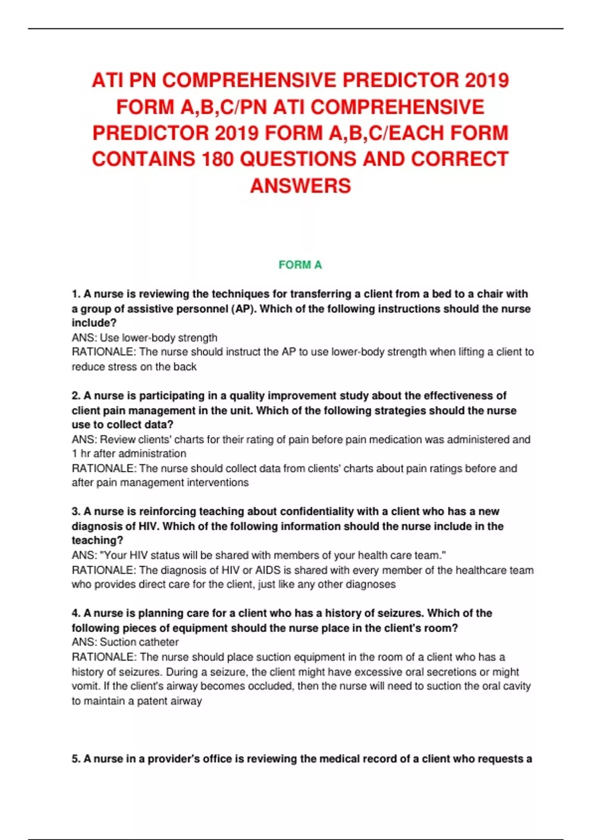 ATI PN COMPREHENSIVE PREDICTOR 2019 FORM A,B,C/PN ATI COMPREHENSIVE PREDICTOR 2019 FORM A,B,C/EACH FORM CONTAINS 180 QUESTIONS AND CORRECT ANSWERS FORM A 1. A nurse is reviewing the techniques for transferring a client from a bed to a chair with a group of assistive personnel (AP). Which of the following instructions should the nurse include? ANS: Use lower-body strength RATIONALE: The nurse should instruct the AP to use lower-body strength when lifting a client to reduce stress on the back 2. A nurse is participating in a quality improvement study about the effectiveness of client pain management in the unit. Which of the following strategies should the nurse use to collect data? ANS: Review clients' charts for their rating of pain before pain medication was administered and 1 hr after administration RATIONALE: The nurse should collect data from clients' charts about pain ratings before and after pain management interventions 3. A nurse is reinforcing teaching about confidentiality with a client who has a new diagnosis of HIV. Which of the following information should the nurse include in the teaching? ANS: "Your HIV status will be shared with members of your health care team." RATIONALE: The diagnosis of HIV or AIDS is shared with every member of the healthcare team who provides direct care for the client, just like any other diagnoses 4. A nurse is planning care for a client who has a history of seizures. Which of the following pieces of equipment should the nurse place in the client's room? ANS: Suction catheter RATIONALE: The nurse should place suction equipment in the room of a client who has a history of seizures. During a seizure, the client might have excessive oral secretions or might vomit. If the client's airway becomes occluded, then the nurse will need to suction the oral cavity to maintain a patent airway 5. A nurse in a provider's office is reviewing the medical record of a client who requests a prescription for an oral contraceptive. Which of the following findings should the nurse identify as a contraindication for oral contraceptive use? ANS: Coronary artery disease