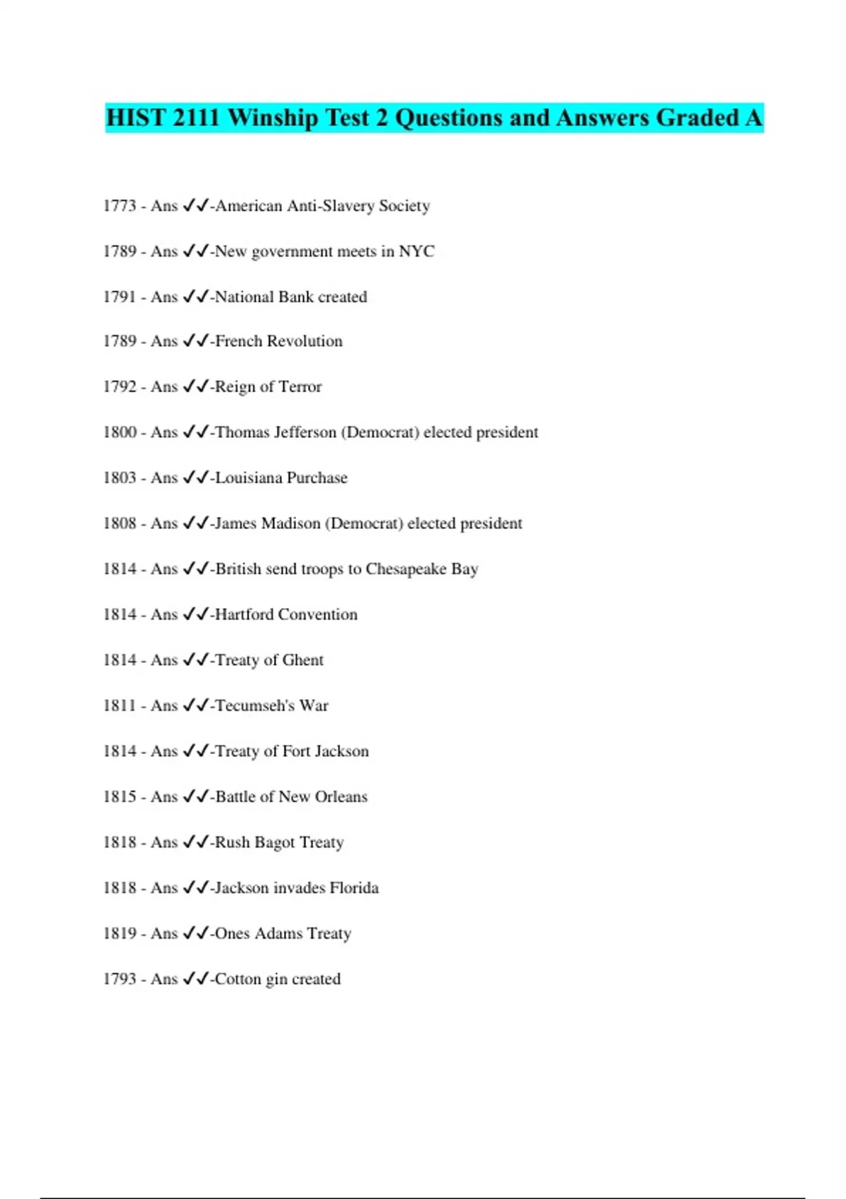 HIST 2111 Winship Test 2 Questions and Answers Graded A 1773 - Ans ️️ -American Anti-Slavery Society 1789 - Ans ️️ -New government meets in NYC 1791 - Ans ️️ -National Bank created 1789 - Ans ️️ -French Revolution 1792 - Ans ️️ -Reign of Terror 1800 - Ans ️️ -Thomas Jefferson (Democrat) elected president 1803 - Ans ️️ -Louisiana Purchase 1808 - Ans ️️ -James Madison (Democrat) elected president 1814 - Ans ️️ -British send troops to Chesapeake Ba