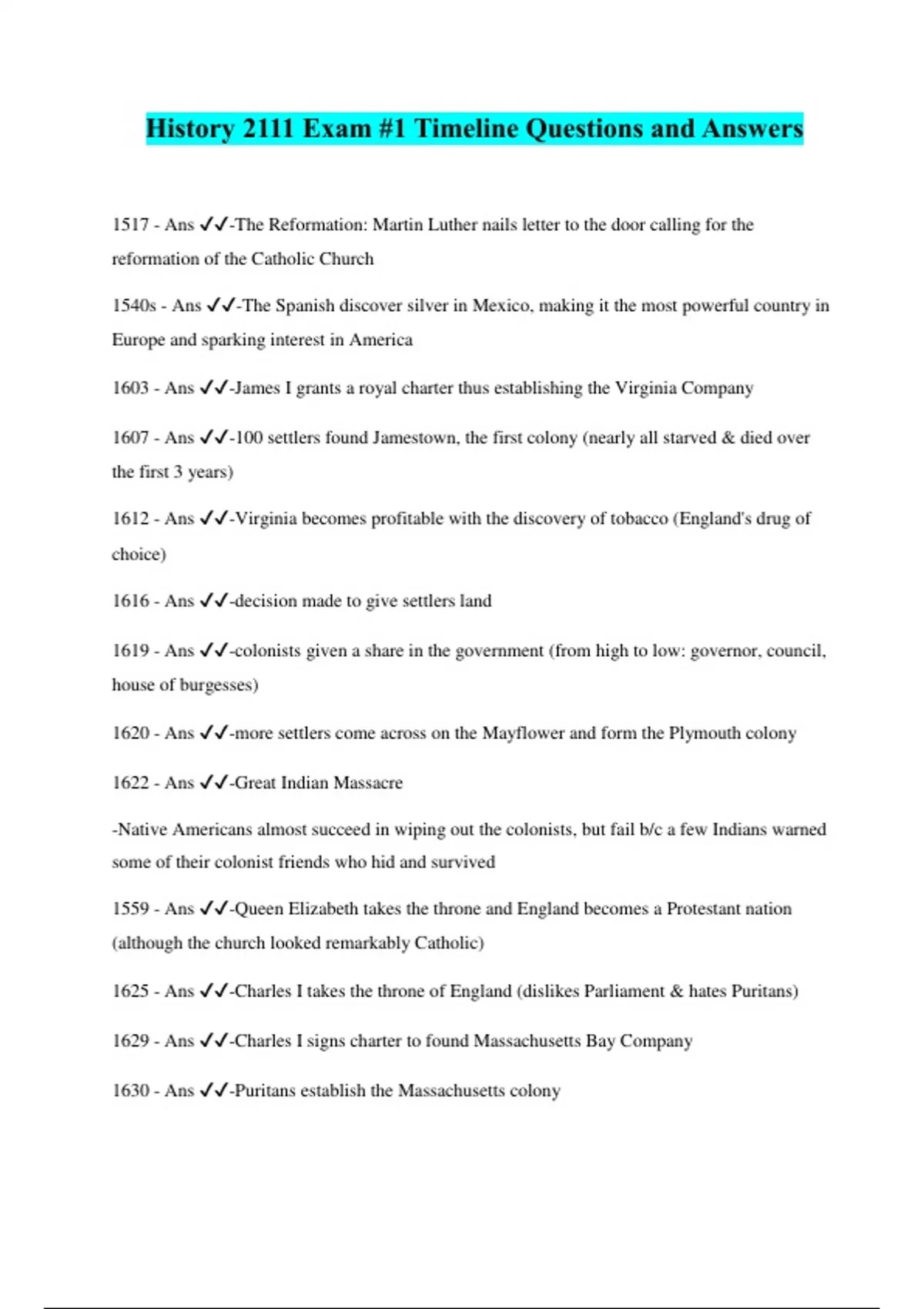 History 2111 Exam #1 Timeline Questions and Answers 1517 - Ans ️️ -The Reformation: Martin Luther nails letter to the door calling for the reformation of the Catholic Church 1540s - Ans ️️ -The Spanish discover silver in Mexico, making it the most powerful country in Europe and sparking interest in America 1603 - Ans ️️ -James I grants a royal charter thus establishing the Virginia Company 1607 - Ans ️️ -100 settlers found Jamestown, the first colony (nearly all starved & died over the first 3 years) 1612 - Ans ️️ -Virginia becomes profitable with the discovery of tobacco (England's drug of choice) 1616 - Ans ️️ -decision made to give settlers land 1619 - Ans ️️ -colonists given a share in the government (from high to low: governor, council, house of burgesses) 1620 - Ans ️️ -more settlers come across on the Mayflower and form the Plymouth colony 1622 - Ans ️️ -Great Indian Massacre -Native Americans almost succeed in wiping out the colonists, but fail b/c a few Indians warned some of their colonist friends who hid and survived 1559 - Ans ️️ -Queen Elizabeth takes the throne and England becomes a Protestant nation (although the church looked remarkably Catholic)