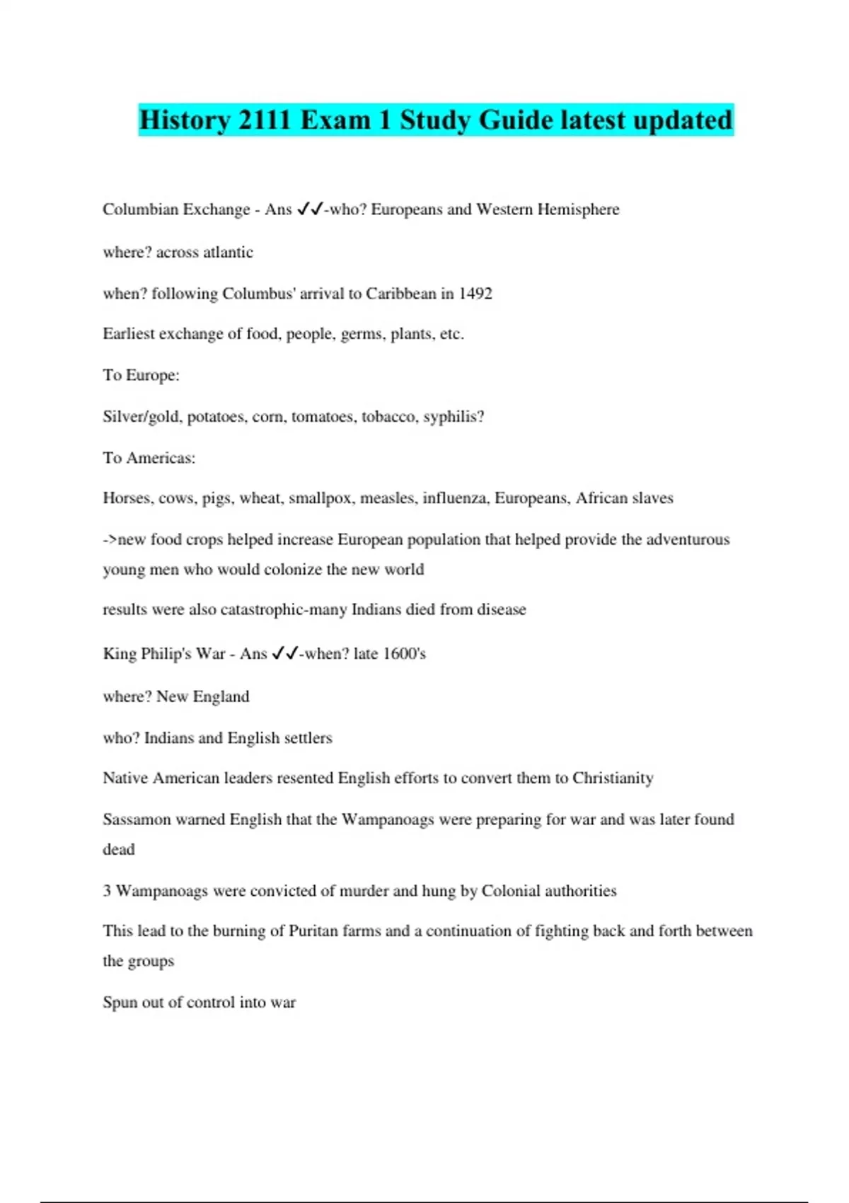 History 2111 Exam 1 Study Guide latest updated Columbian Exchange - Ans ️️ -who? Europeans and Western Hemisphere where? across atlantic when? following Columbus' arrival to Caribbean in 1492 Earliest exchange of food, people, germs, plants, etc. To Europe: Silver/gold, potatoes, corn, tomatoes, tobacco, syphilis? To Americas: Horses, cows, pigs, wheat, smallpox, measles, influenza, Europeans, African slaves ->new food crops helped increase European population that helped provide the adventurous young men who would colonize the new world results were also catastrophic-many Indians died from disease King Philip's War - Ans ️️ -when? late 1600's where? New England who? Indians and English settlers Native American leaders resented English efforts to convert them to Christianity Sassamon warned English that the Wampanoags were preparing for war and was later found dead 3 Wampanoags were convicted of murder and hung by Colonial authorities This lead to the burning of Puritan farms and a continuation of fighting back and forth between the groups Spun out of control into war