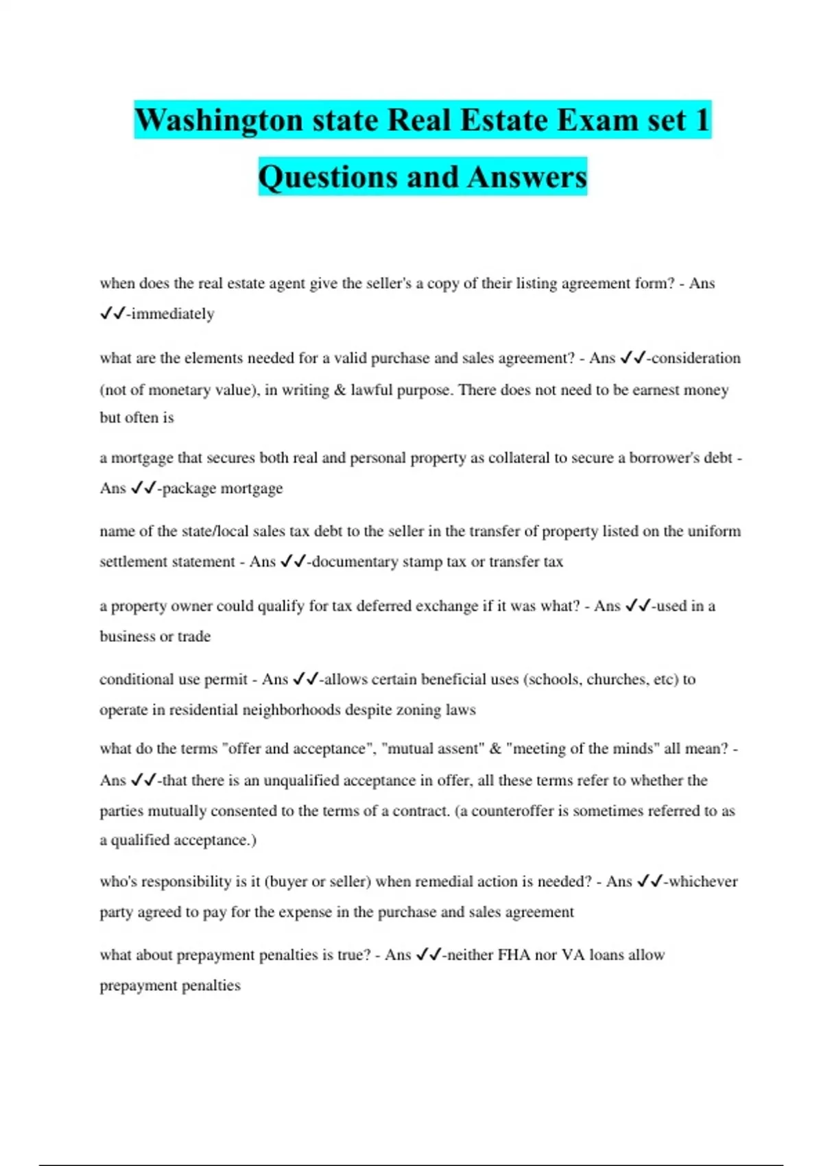 Washington state Real Estate Exam set 1 Questions and Answers when does the real estate agent give the seller's a copy of their listing agreement form? - Ans ️️ -immediately what are the elements needed for a valid purchase and sales agreement? - Ans ️️ -consideration (not of monetary value), in writing & lawful purpose. There does not need to be earnest money but often is a mortgage that secures both real and personal property as collateral to secure a borrower's debt - Ans ️️ -package mortgage name of the state/local sales tax debt to the seller in the transfer of property listed on the uniform settlement statement - Ans ️️ -documentary stamp tax or transfer tax a property owner could qualify for tax deferred exchange if it was what? - Ans ️️ -used in a business or trade conditional use permit - Ans ️️ -allows certain beneficial uses (schools, churches, etc) to operate in residential neighborhoods despite zoning laws what do the terms "offer and acceptance", "mutual assent" & "meeting of the minds" all mean? - Ans ️️ -that there is an unqualified acceptance in offer, all these terms refer to whether the parties mutually consented to the terms of a contract. (a counteroffer is sometimes referred to as a qualified acceptance.) who's responsibility is it (buyer or seller) when remedial action is needed? - Ans ️️ -whichever party agreed to pay for the expense in the purchase and sales agreement what about prepayment penalties is true? - Ans ️️ -neither FHA nor VA loans allow prepayment penalties