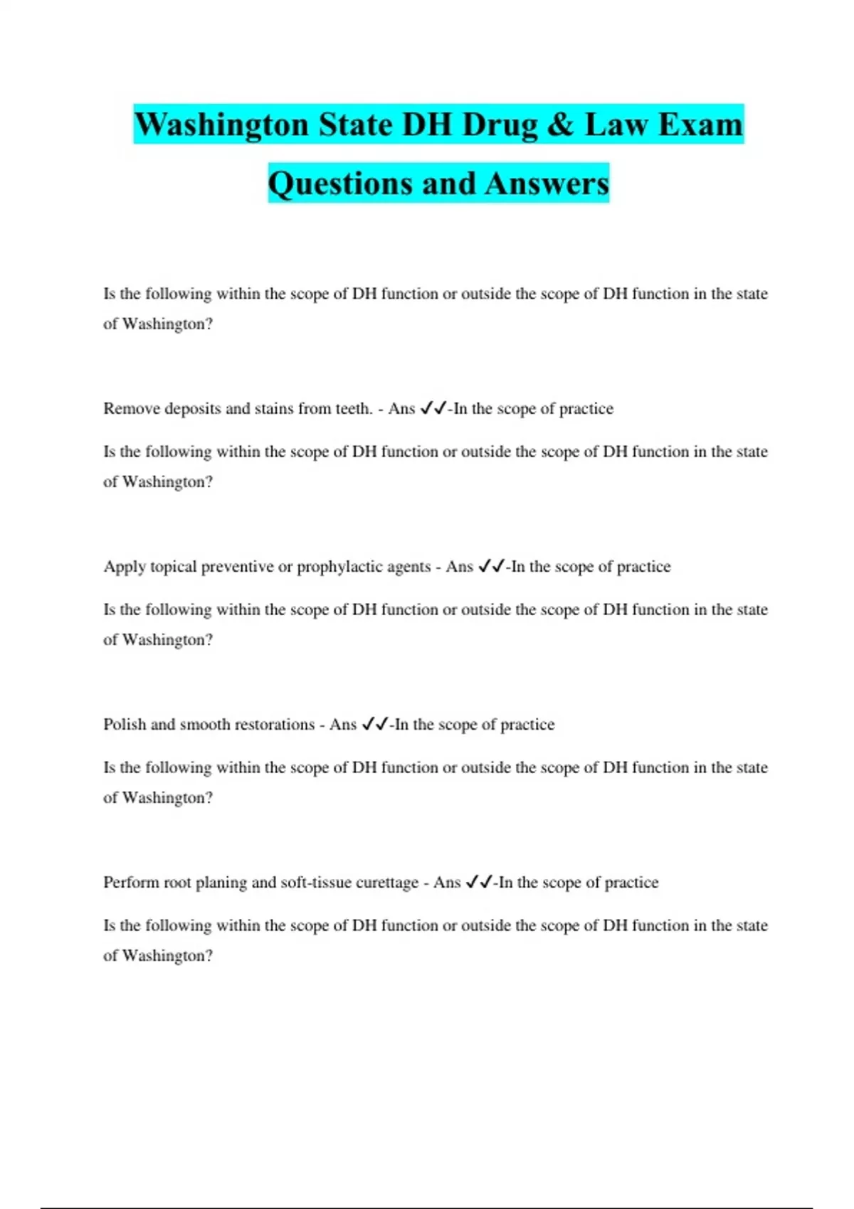 Washington State DH Drug & Law Exam Questions and Answers Is the following within the scope of DH function or outside the scope of DH function in the state of Washington? Remove deposits and stains from teeth. - Ans ️️ -In the scope of practice Is the following within the scope of DH function or outside the scope of DH function in the state of Washington? Apply topical preventive or prophylactic agents - Ans ️️ -In the scope of practice Is the following within the scope of DH function or outside the scope of DH function in the state of Washington? Polish and smooth restorations - Ans ️️ -In the scope of practice Is the following within the scope of DH function or outside the scope of DH function in the state of Washington? Perform root planing and soft-tissue curettage - Ans ️️ -In the scope of practice Is the following within the scope of DH function or outside the scope of DH function in the state of Washington? Perform other dental services delegated by a dentist - Ans ️️ -In the scope of practice Is the following within the scope of DH function or outside the scope of DH function in the state of Washington? Apply topical anesthetic under general supervision - Ans ️️ -In the scope of practice Is the following within the scope of DH function or outside the scope of DH function in the state of Washington? Surgical removal of tissue of the oral cavity - Ans ️️ -Outside the scope of practice Is the following within the scope of DH function or outside the scope of DH function in the state of Washingto