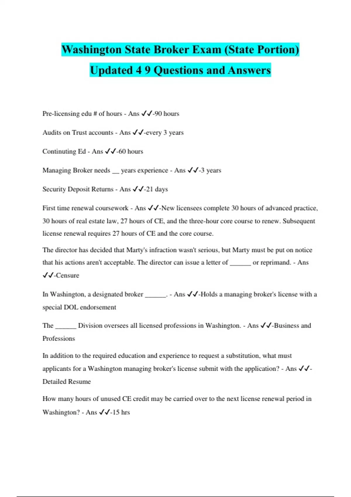 Washington State Broker Exam (State Portion) Updated 4 9 Questions and Answers Pre-licensing edu # of hours - Ans ️️ -90 hours Audits on Trust accounts - Ans ️️ -every 3 years Continuting Ed - Ans ️️ -60 hours Managing Broker needs __ years experience - Ans ️️ -3 years Security Deposit Returns - Ans ️️ -21 days First time renewal coursework - Ans ️️ -New licensees complete 30 hours of advanced practice, 30 hours of real estate law, 27 hours of CE, and the three-hour core course to renew. Subsequent license renewal requires 27 hours of CE and the core course. The director has decided that Marty's infraction wasn't serious, but Marty must be put on notice that his actions aren't acceptable. The director can issue a letter of ______ or reprimand. - Ans ️️ -Censure In Washington, a designated broker ______. - Ans ️️ -Holds a managing broker's license with a special DOL endorsement The ______ Division oversees all licensed professions in Washington. - Ans ️️ -Business and Professions In addition to the required education and experience to request a substitution, what must applicants for a Washington managing broker's license submit with the application? - Ans ️️ - Detailed Resume How many hours of unused CE credit may be carried over to the next license renewal period in Washington? - Ans ️️ -15 hrs