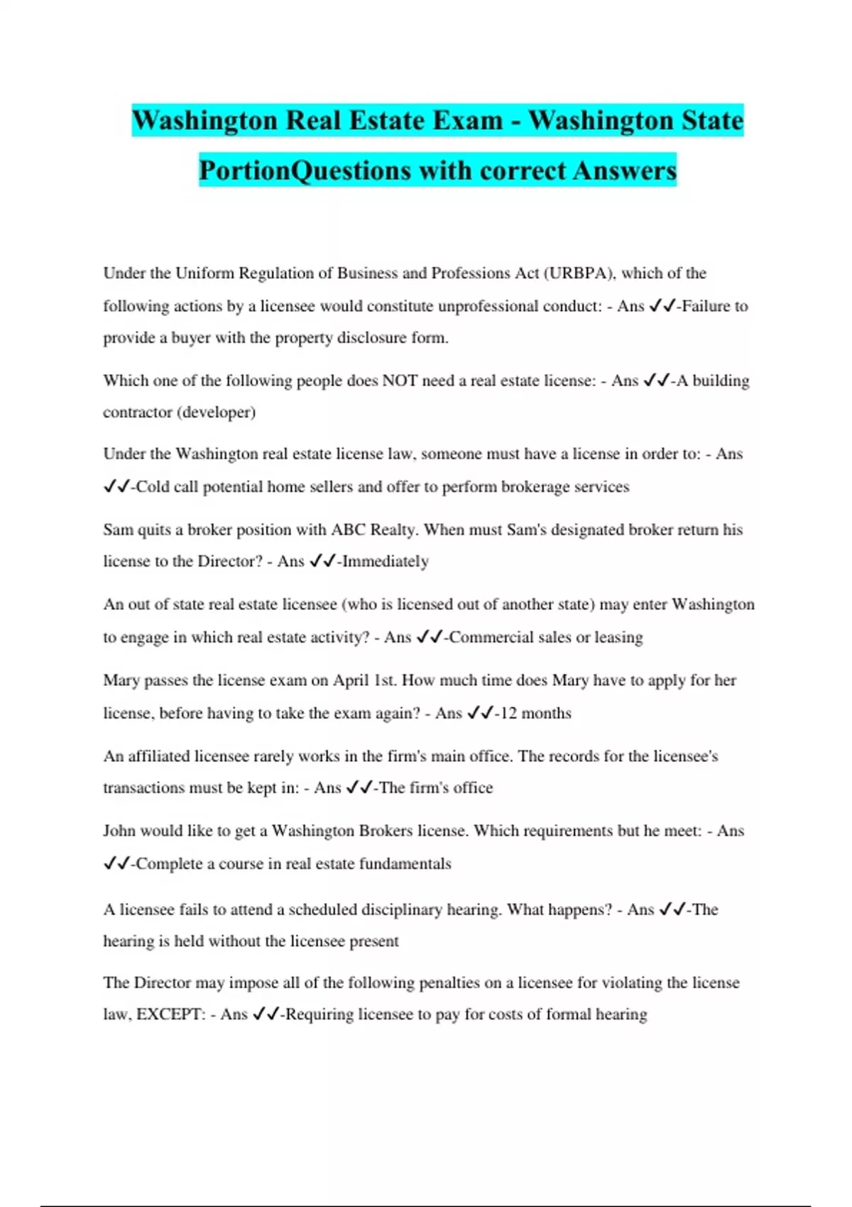 Washington Real Estate Exam - Washington State PortionQuestions with correct Answers Under the Uniform Regulation of Business and Professions Act (URBPA), which of the following actions by a licensee would constitute unprofessional conduct: - Ans ️️ -Failure to provide a buyer with the property disclosure form. Which one of the following people does NOT need a real estate license: - Ans ️️ -A building contractor (developer) Under the Washington real estate license law, someone must have a license in order to: - Ans ️️ -Cold call potential home sellers and offer to perform brokerage services Sam quits a broker position with ABC Realty. When must Sam's designated broker return his license to the Director? - Ans ️️ -Immediately An out of state real estate licensee (who is licensed out of another state) may enter Washington to engage in which real estate activity? - Ans ️️ -Commercial sales or leasing Mary passes the license exam on April 1st. How much time does Mary have to apply for her license, before having to take the exam again? - Ans ️️ -12 months An affiliated licensee rarely works in the firm's main office. The records for the licensee's transactions must be kept in: - Ans ️️ -The firm's office John would like to get a Washington Brokers license. Which requirements but he meet: - Ans ️️ -Complete a course in real estate fundamentals A licensee fails to attend a scheduled disciplinary hearing. What happens? - Ans ️️ -The hearing is held without the licensee present The Director may impose all of the following penalties on a licensee for violating the license law, EXCEPT: - Ans ️️ -Requiring licensee to pay for costs of formal hearing
