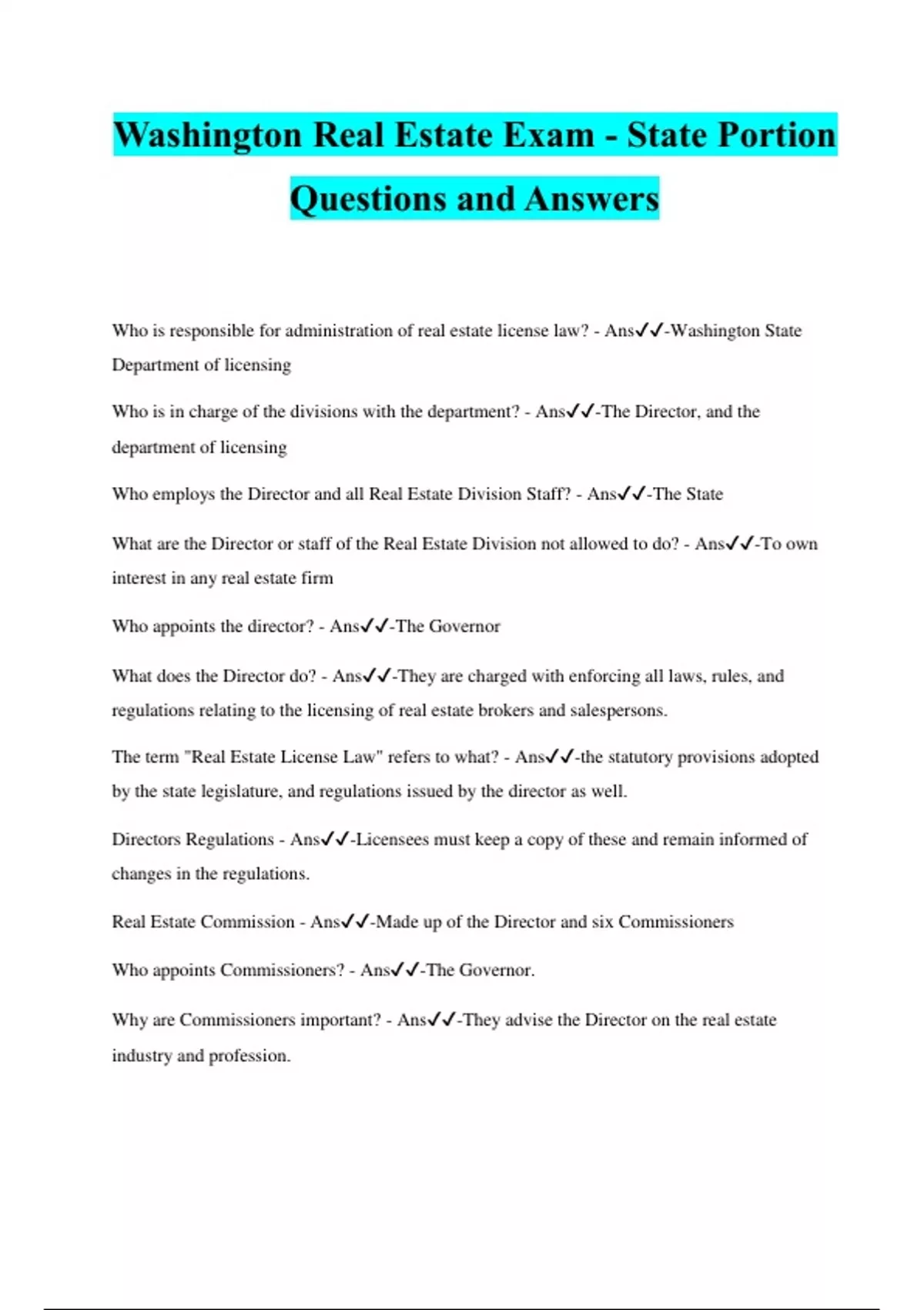 Washington Real Estate Exam - State Portion Questions and Answers Who is responsible for administration of real estate license law? - Ans️️ -Washington State Department of licensing Who is in charge of the divisions with the department? - Ans️️ -The Director, and the department of licensing Who employs the Director and all Real Estate Division Staff? - Ans️️ -The State What are the Director or staff of the Real Estate Division not allowed to do? - Ans️️ -To own interest in any real estate firm Who appoints the director? - Ans️️ -The Governor What does the Director do? - Ans️️ -They are charged with enforcing all laws, rules, and regulations relating to the licensing of real estate brokers and salespersons. The term "Real Estate License Law" refers to what? - Ans️️ -the statutory provisions adopted by the state legislature, and regulations issued by the director as well. Directors Regulations - Ans️️ -Licensees must keep a copy of these and remain informed of changes in the regulations. Real Estate Commission - Ans️️ -Made up of the Director and six Commissioners Who appoints Commissioners? - Ans️️ -The Governor. Why are Commissioners important? - Ans️️ -They advise the Director on the real estate industry and profession.