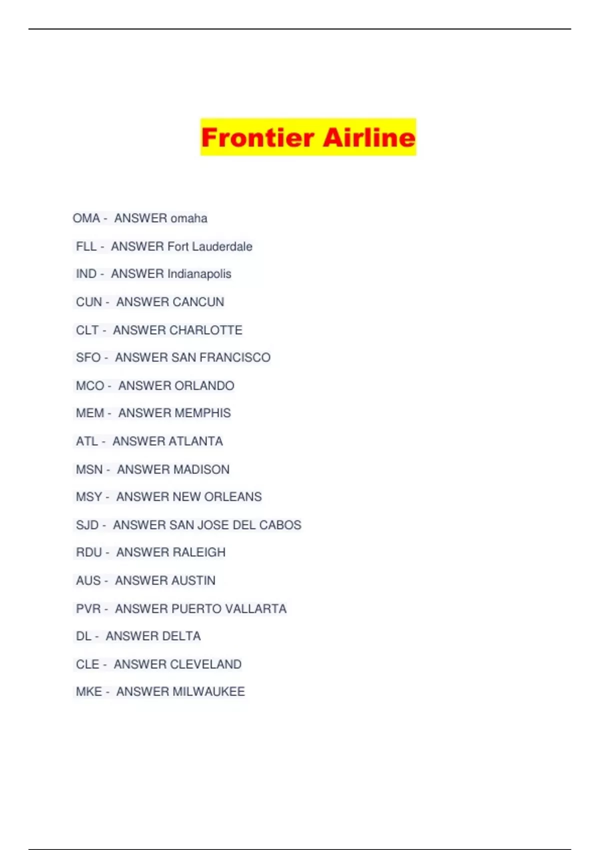 Frontier Airline OMA - ANSWER omaha FLL - ANSWER Fort Lauderdale IND - ANSWER Indianapolis CUN - ANSWER CANCUN CLT - ANSWER CHARLOTTE SFO - ANSWER SAN FRANCISCO MCO - ANSWER ORLANDO MEM - ANSWER MEMPHIS ATL - ANSWER ATLANTA MSN - ANSWER MADISON MSY - ANSWER NEW ORLEANS SJD - ANSWER SAN JOSE DEL CABOS RDU - ANSWER RALEIGH AUS - ANSWER AUSTIN PVR - ANSWER PUERTO VALLARTA DL - ANSWER DELTA CLE - ANSWER CLEVELAND MKE - ANSWER MILWAUKEE