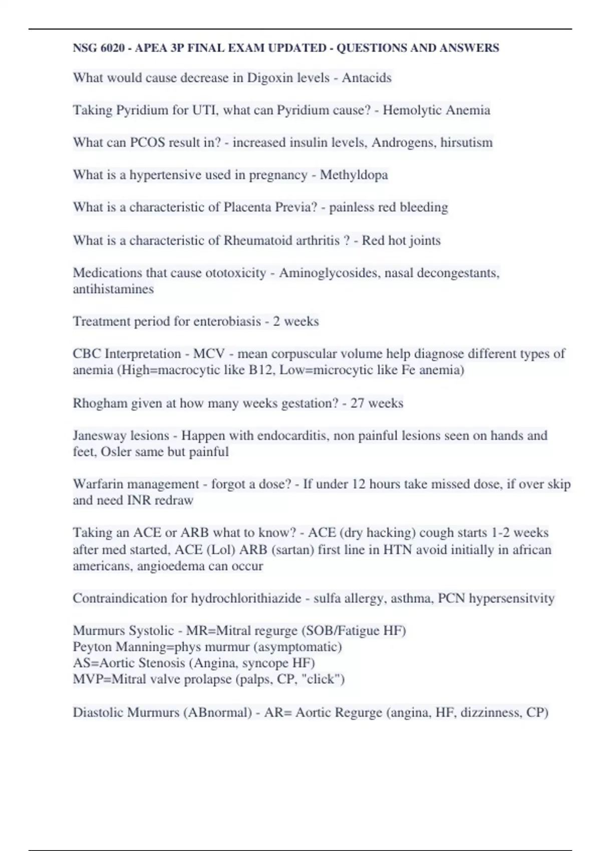 What would cause decrease in Digoxin levels - Antacids Taking Pyridium for UTI, what can Pyridium cause? - Hemolytic Anemia What can PCOS result in? - increased insulin levels, Androgens, hirsutism What is a hypertensive used in pregnancy - Methyldopa What is a characteristic of Placenta Previa? - painless red bleeding What is a characteristic of Rheumatoid arthritis ? - Red hot joints Medications that cause ototoxicity - Aminoglycosides, nasal decongestants, antihistamines Treatment period for enterobiasis - 2 weeks CBC Interpretation - MCV - mean corpuscular volume help diagnose different types of anemia (High=macrocytic like B12, Low=microcytic like Fe anemia) Rhogham given at how many weeks gestation? - 27 weeks Janesway lesions - Happen with endocarditis, non painful lesions seen on hands and feet, Osler same but painful Warfarin management - forgot a dose? - If under 12 hours take missed dose, if over skip and need INR redraw Taking an ACE or ARB what to know? - ACE (dry hacking) cough starts 1-2 weeks after med started, ACE (Lol) ARB (sartan) first line in HTN avoid initially in african americans, angioedema can occur Contraindication for hydrochlorithiazide - sulfa allergy, asthma, PCN hypersensitvity Murmurs Systolic - MR=Mitral regurge (SOB/Fatigue HF) Peyton Manning=phys murmur (asymptomatic) AS=Aortic Stenosis (Angina, syncope HF) MVP=Mitral valve prolapse (palps, CP, "click") Diastolic Murmurs (ABnormal) - AR= Aortic Regurge (angina, HF, dizzinness, CP) MS=Mitral stenosis (Dyspnea, Afib) Motivated - Systole-S1 closure of AV Mitral/tricuspid valve (lub) Mitral, Tricuspid, atrioventricular valves Apples - Diastole s2 closure of the aortic pulmonic valves (dub) aortic pulmonic semilunar Abnormal (extra) heart sounds - S3- CHF; possible normal for adolescent athletes, S4 LVH poorly controlled HTN, unstable angina Assessment of PAD - antiplatelets (Plavix, ASA), Pentoxifylline (decreases blood viscosity) to treat, ankle brachial index to check, angiography gold standard to diagnose Coronary artery Disease tx - Atorvastatin/rovustatin- use high dose meds for LDL>150, watch for LFTs and arthralgia. Change type and dose if problems. Stabilization of plaque with statins HF treatment - ACEI, ARB, or ARNI with BB and aldosterone receptor antagonist Scabies Treatment (Sarcopter Scabiei) - Topical Permethrin massaged from head to soles of feet and wach off with shower or bath after 8-14 hours. Treat again in 1 week Names of skin findings - Macule; freckle <1 cm, Papule Macule >1 cm chloasma, Papule <0.5cm elevated nevi (molluscum wart), Plaque (psoriasis, lichen planus), Nodule 0.5-2 cm lipoma, vesicle (herpes simplex contact derm, Keloid - hypertrophic scar that is invasive beyond point of original injury Skin continued - Bulla-second degree burn, friction burn Wheal- raised, mosquito bite, hive Scales;dandruff Crusts-scab from abrasian, impetigo Tinea - Fungal infections; Tinea capitis-round patchy scales on scalp (cradle cap) treatment Grisefulvin take with high fat meal 4-6 weeks 500 mg tinea corporis -red and scaly plaque on trunk (ring worm) Treatment is an azole for 2 weeks Melanoma How do you assess - ABCDE Asymmetry, border, color, diameter >6 mm, elevation Psoriasis - silvery white scales, nails are pitted; positive Auspitz sign- pinpoint bleeding occurs when lesions are scraped Shingles (Herpes Zoster) - Unilateral dermatomal rash- painful as it progresses to vesicles, Acyclovir within 48-72 hours or symptoms. May only transmit chickenpox virus to susceptible patients that have not gotten exposed or vaccinated yet. Post herpetic neuralgia pain is longer than 1 month after rash has resolved. Contact dermatitis - papules or vesicles 5mm or less, scaling, crusting, oozing. Tx corticosteroids/antihistamines Acne Vulgaris - Inflamm disorder where androgen-dependent sebaceous glands produce excess sebum. Areas most commonly affected are face, anterior and posterior chest, arms and shoulders. Treatment: Erythromycin/Benzyl peroxide=limit exposure to sunlight peroxide can decrease resistance to erythromycin Atopic dermatitis - Patchy plaque like rash with inflammation. common in people with other atopic illnesses (asthma, allergic rhinitis) Eye Findings in HTN and DM - AV nicking-arteries indent and displace veins, cotton wool spots-gradual vision loss, flame hemorrhages- blot and dot hemorrhages Tx of acute sinusitis in adults and pediatrics - Viral symptomatic tx only, is bacterial- amoxicillin first line symptoms>10 days purulent nasal discharge, fever, unilateral face or tooth pain Snellen test - Test for visual acuity; CN II What medications can cause ototoxicity - Aminoglycosides (tx otitis externa) , loop diuretics, quinine, ASA Rhinitis - Eosinophils due to WORMS, wheezes, weird diseases. Most effective tx for allergic rhinitis- Fluticasone Flonase Acute bacterial rhinosinusitis - For empiric tx of patients with acute bacterial rhinosinusitis who are allergic to penicillin, the best alternative first line therapy is Doxycycline Which immunoglobulin is responisble for the symptoms in the patient with allergic rhinitis? - IgE