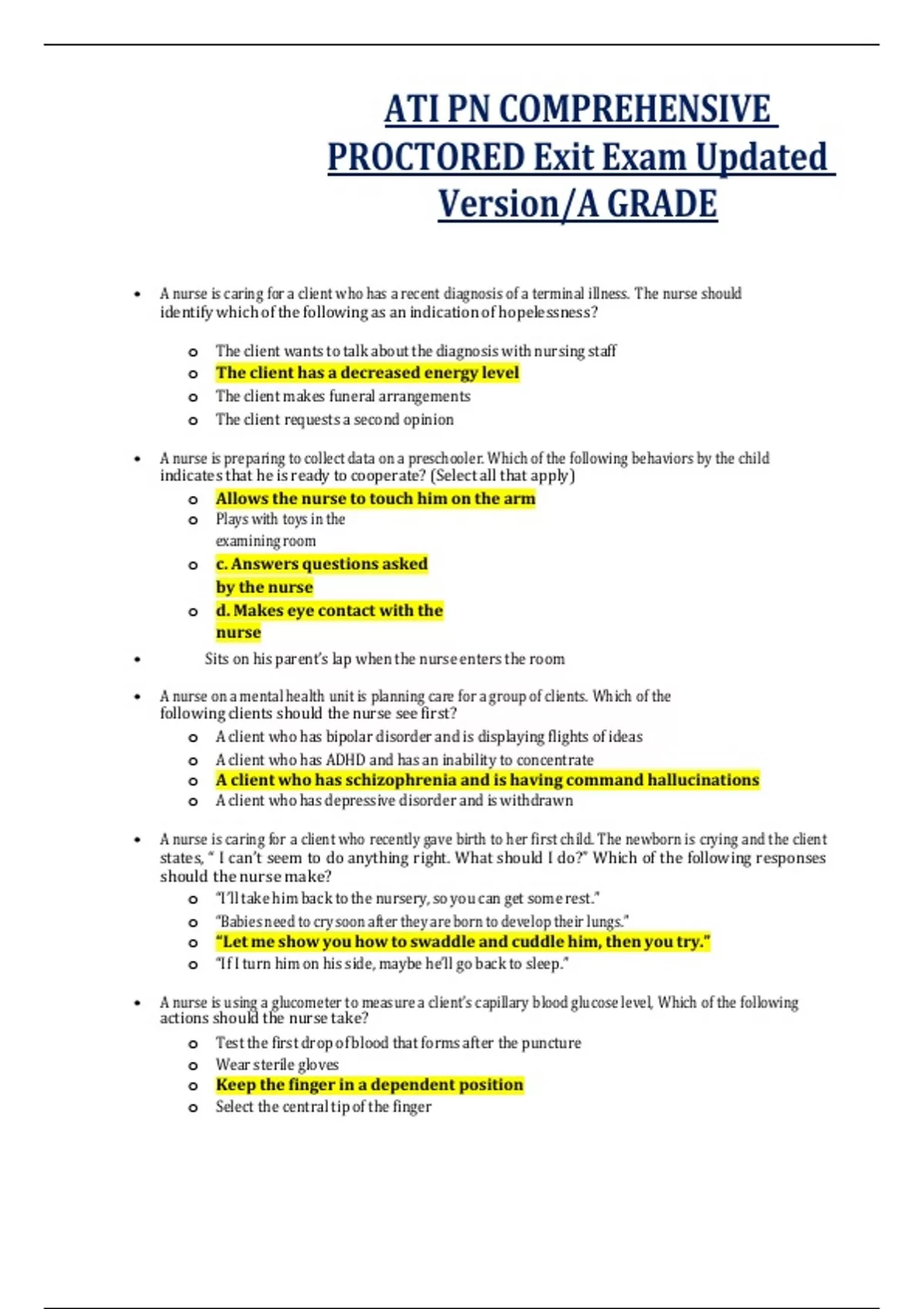 ATI PN COMPREHENSIVE PROCTORED Exit Exam Updated Version/A GRADE • A nurse is caring for a client who has a recent diagnosis of a terminal illness. The nurse should identify which of the following as an indication of hopelessness? o The client wants to talk about the diagnosis with nursing staff o The client has a decreased energy level o The client makes funeral arrangements o The client requests a second opinion • A nurse is preparing to collect data on a preschooler. Which of the following behaviors by the child indicates that he is ready to cooperate? (Select all that apply) o Allows the nurse to touch him on the arm o Plays with toys in the examining room o c. Answers questions asked by the nurse o d. Makes eye contact with the nurse • Sits on his parent’s lap when the nurse enters the room • A nurse on a mental health unit is planning care for a group of clients. Which of the following clients should the nurse see first? o A client who has bipolar disorder and is displaying flights of ideas o A client who has ADHD and has an inability to concentrate o A client who has schizophrenia and is having command hallucinations o A client who has depressive disorder and is withdrawn • A nurse is caring for a client who recently gave birth to her first child. The newborn is crying and the client states, “ I can’t seem to do anything right. What should I do?” Which of the following responses should the nurse make? o “I’ll take him back to the nursery, so you can get some rest.” o “Babies need to cry soon after they are born to develop their lungs.” o “Let me show you how to swaddle and cuddle him, then you try.” o “If I turn him on his side, maybe he’ll go back to sleep.” • A nurse is using a glucometer to measure a client’s capillary blood glucose level, Which of the following actions should the nurse take? o Test the first drop of blood that forms after the puncture o Wear sterile gloves o Keep the finger in a dependent position o Select the central tip of the finger • A nurse is reviewing the home medications of a client who recently had transient ischemic attacks and is to begin taking clopidogrel. The nurse should instruct the client that which of the following over-the- counter medications interacts adversely with clopidogrel? o Docusate sodium o Ranitidine o Vitamin D3 o Naproxen • A nurse is collecting data from a client who has a long leg cast that was applied 2 days ago. The client’s foot is pale with a weak pedal pulse, and the client reports foot numbness. Which