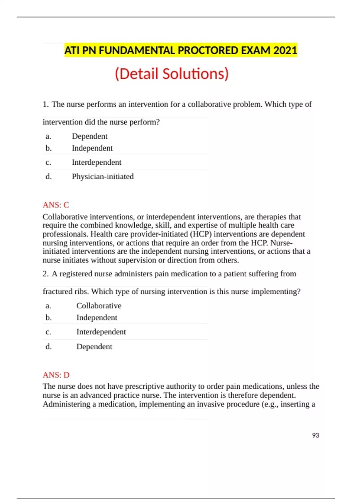 ATI PN FUNDAMENTAL PROCTORED EXAM 2021 (Detail Solutions) 1. The nurse performs an intervention for a collaborative problem. Which type of intervention did the nurse perform? a. Dependent b. Independent c. Interdependent d. Physician-initiated ANS: C Collaborative interventions, or interdependent interventions, are therapies that require the combined knowledge, skill, and expertise of multiple health care professionals. Health care provider-initiated (HCP) interventions are dependent nursing interventions, or actions that require an order from the HCP. Nurse- initiated interventions are the independent nursing interventions, or actions that a nurse initiates without supervision or direction from others. 2. A registered nurse administers pain medication to a patient suffering from fractured ribs. Which type of nursing intervention is this nurse implementing? a. Collaborative b. Independent c. Interdependent d. Dependent ANS: D The nurse does not have prescriptive authority to order pain medications, unless the nurse is an advanced practice nurse. The intervention is therefore dependent. Administering a medication, implementing an invasive procedure (e.g., inserting a 93 Foley catheter, starting an intravenous [IV] infusion), and preparing a patient for diagnostic tests are examples of health care provider-initiated interventions. A collaborative, or an interdependent, intervention involves therapies that require combined knowledge, skill, and expertise from multiple health care professionals. Nurse-initiated interventions are the independent nursing interventions, or actions that a nurse initiates without supervision or direction from others. 3. Which action indicates the nurse is using a PICOT question to improve care for a patient? a. Practices nursing based on the evidence presented in court b. Implements interventions based on scientific research c. Uses standardized care plans for all patients. d. Plans care based on tradition ANS: B The best answer is implementing interventions based on scientific research. Using results of a literature search to a PICOT question can help a nurse decide