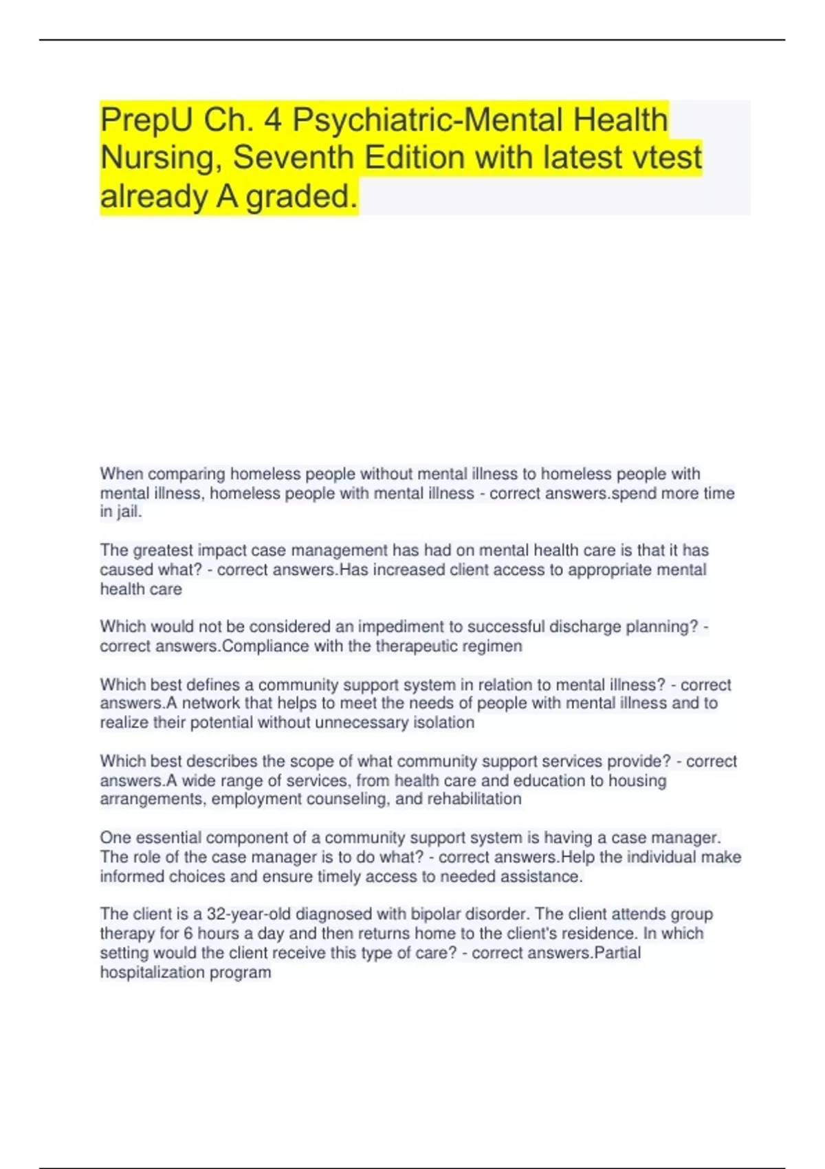 PrepU Ch. 4 Psychiatric-Mental Health Nursing, Seventh Edition with latest vtest already A graded. When comparing homeless people without mental illness to homeless people with mental illness, homeless people with mental illness - correct more time in jail. The greatest impact case management has had on mental health care is that it has caused what? - correct answers.Has increased client access to appropriate mental health care Which would not be considered an impediment to successful discharge planning? - correct answers.Compliance with the therapeutic regimen Which best defines a community support system in relation to mental illness? - correct answers.A network that helps to meet the needs of people with mental illness and to realize their potential without unnecessary isolation Which best describes the scope of what community support services provide? - correct answers.A wide range of services, from health care and education to housing arrangements, employment counseling, and rehabilitation One essential component of a community support system is having a case manager. The role of the case manager is to do what? - correct answers.Help the individual make informed choices and ensure timely access to needed assistance. The client is a 32-year-old diagnosed with bipolar disorder. The client attends group therapy for 6 hours a day and then returns home to the client's residence. In which setting would the client receive this type of care? - correct answers.Partial hospitalization program