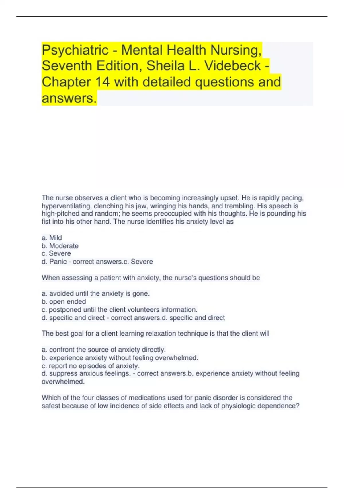 Psychiatric - Mental Health Nursing, Seventh Edition, Sheila L. Videbeck - Chapter 14 with detailed questions and answers. The nurse observes a client who is becoming increasingly upset. He is rapidly pacing, hyperventilating, clenching his jaw, wringing his hands, and trembling. His speech is high-pitched and random; he seems preoccupied with his thoughts. He is pounding his fist into his other hand. The nurse identifies his anxiety level as a. Mild b. Moderate c. Severe d. Panic - correct answers.c. Severe When assessing a patient with anxiety, the nurse's questions should be a. avoided until the anxiety is gone. b. open ended c. postponed until the client volunteers information. d. specific and direct - correct answers.d. specific and direct The best goal for a client learning relaxation technique is that the client will a. confront the source of anxiety directly. b. experience anxiety without feeling overwhelmed. c. report no episodes of anxiety. d. suppress anxious feelings. - correct answers.b. experience anxiety without feeling overwhelmed. Which of the four classes of medications used for panic disorder is considered the safest because of low incidence of side effects and lack of physiologic dependence?