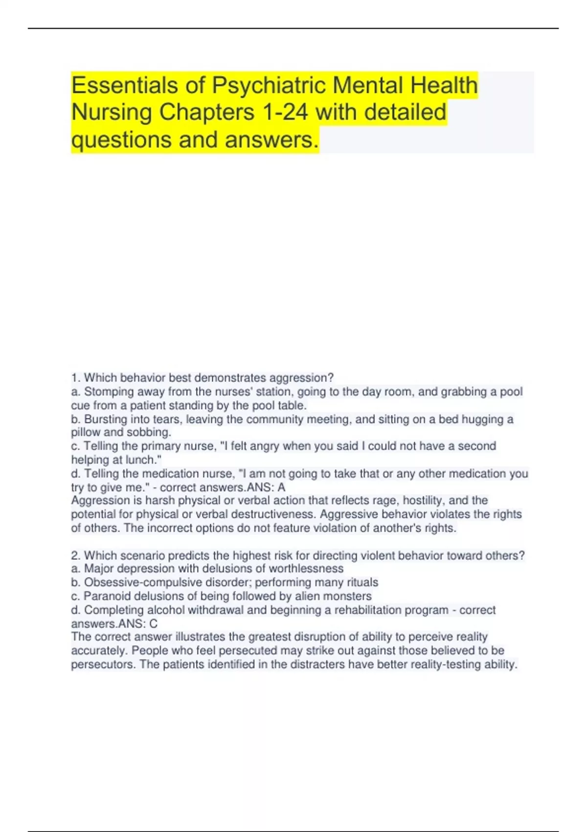Essentials of Psychiatric Mental Health Nursing Chapters 1-24 with detailed questions and answers. 1. Which behavior best demonstrates aggression? a. Stomping away from the nurses' station, going to the day room, and grabbing a pool cue from a patient standing by the pool table. b. Bursting into tears, leaving the community meeting, and sitting on a bed hugging a pillow and sobbing. c. Telling the primary nurse, "I felt angry when you said I could not have a second helping at lunch." d. Telling the medication nurse, "I am not going to take that or any other medication you try to give me." - correct answers.ANS: A Aggression is harsh physical or verbal action that reflects rage, hostility, and the potential for physical or verbal destructiveness. Aggressive behavior violates the rights of others. The incorrect options do not feature violation of another's rights. 2. Which scenario predicts the highest risk for directing violent behavior toward others? a. Major depression with delusions of worthlessness b. Obsessive-compulsive disorder; performing many rituals c. Paranoid delusions of being followed by alien monsters d. Completing alcohol withdrawal and beginning a rehabilitation program - correct answers.ANS: C The correct answer illustrates the greatest disruption of ability to perceive reality accurately. People who feel persecuted may strike out against those believed to be persecutors. The patients identified in the distracters have better reality-testing ability. 3. A patient is hospitalized after an arrest for breaking windows in the home of a former domestic partner. The history reveals childhood abuse by a punitive parent, torturing family pets, and an arrest for disorderly conduct. Which nursing diagnosis has priority? a. Risk for injury b. Posttrauma response c. Disturbed thought processes d. Risk for other-directed violence - correct answers.ANS: D The defining characteristics for Risk for other-directed violence include a history of being abused as a child, having committed other violent acts, and demonstrating poor impulse control. The defining characteristics for the other diagnoses are not present in this scenario. 4. A confused older adult patient in a skilled care facility is in bed sleeping. The nurse enters the room quietly and touches the bed to see if it is wet. The patient awakens and hits the nurse in the face. Which statement best explains the patient's action? a. Older adult patients often demonstrate exaggerations of behaviors used earlier in life. b. Crowding in skilled care facilities increases individual tendencies toward violence. c. The patient interpreted the health care worker's behavior as potentially harmful. d. This patient learned violent behavior by watching other patients act out. - correct answers.ANS: C Confused patients are not always able to evaluate accurately the actions of others. This patient behaved as though provoked by the intrusive actions of the staff member. 5. A patient is pacing the hall near the nurses' station, swearing loudly. An appropriate initial intervention for the nurse would be to address the patient by name and say: a. "Hey, what's going on?" b. "Please quiet down immediately." c. "I'd like to talk with you about how you're feeling right now." d. "You must go to your room and try to get control of yourself." - correct answers.ANS: C Intervention should begin with an analysis of the patient and situation. With this response, the nurse is attempting to hear the patient's feelings and concerns, which leads to the next step of planning an intervention. 6. A patient was responding to auditory hallucinations earlier in the morning. The patient approaches the nurse, shaking a fist and shouting, "Back off!" and then goes into the day room. As the nurse follows the patient into the day room, the nurse should: a. make sure adequate physical space exists between the nurse and the patient. b. move into a position that allows the patient to be close to the door. c. maintain one arm's length distance from the patient. d. sit down in a chair near the patient. - correct answers.ANS: A Making sure space is present between the nurse and the patient avoids invading the patient's personal space. Personal space needs increase when a patient feels anxious and threatened. Allowing the patient to block the nurse's exit from the room is not wise. Closeness may be threatening to the patient and provoke aggression. Sitting is inadvisable until further assessment suggests the patient's aggression is abating. One arm's length is inadequate space. 7. An intramuscular dose of antipsychotic medication needs to be given to a patient who is becoming increasingly more aggressive. The patient is in the day room. The nurse should enter the day room: a. and say, "Would you like to come to your room and take some medication your doctor prescribed for you?" b. accompanied by three staff members and say, "Please come to your room so I can give you some medication that will help you feel more comfortable." c. and place the patient in a basket-hold and then say, "I am going to take you to your room to give you an injection of medication to calm you." d. accompanied by a male nursing assistant and tell the patient, "You can come to your room willingly so I can give you this medication, or the aide and I will take you there." - correct answers.ANS: B A patient gains feelings of security if he or she sees that others are present to help with control. The nurse gives a simple direction, honestly states what is going to happen, and reassures the patient that the intervention will be helpful. This positive approach assumes that the patient can act responsibly and will maintain control. Physical control measures should be used only as a last resort. 8. After an assault by a patient, a nurse has difficulty sleeping, startles easily, and is preoccupied with the incident. The nurse says, "I dread facing potentially violent patients." Which response would be the most urgent re