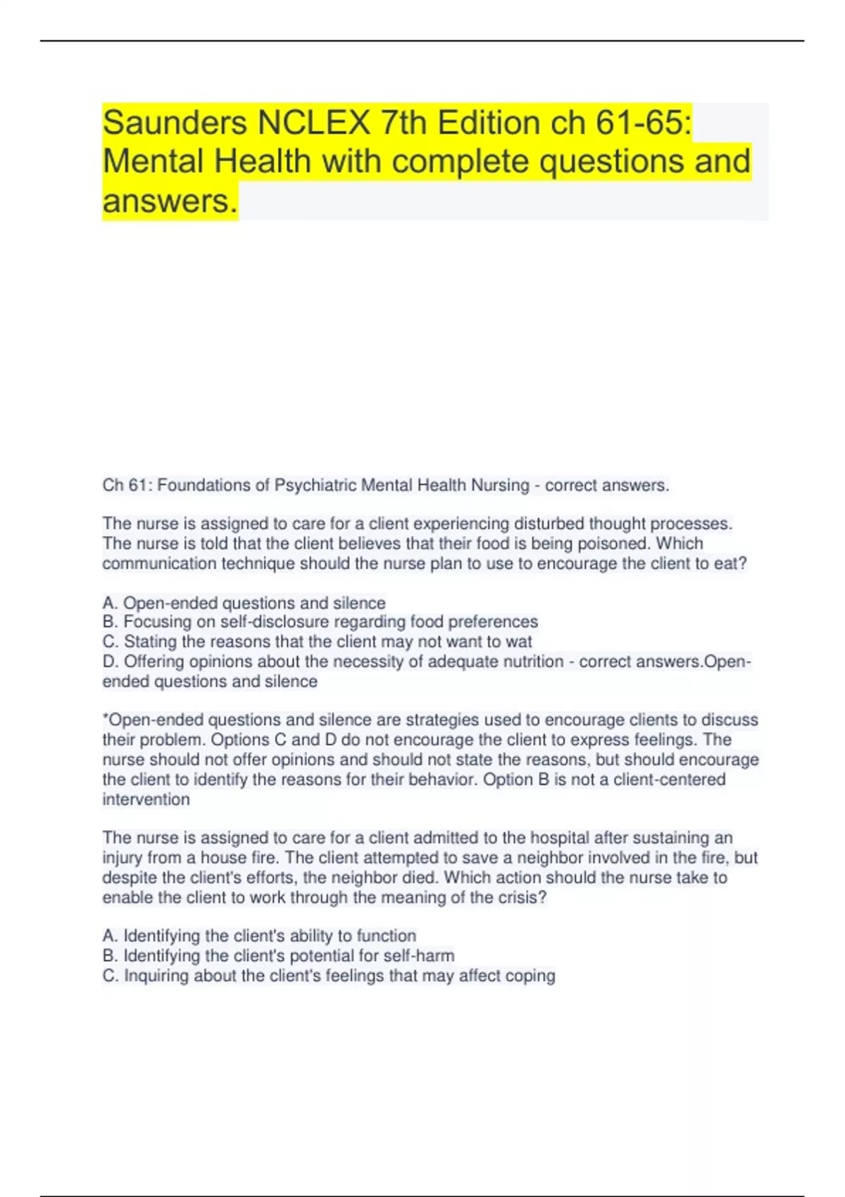 Saunders NCLEX 7th Edition ch 61-65: Mental Health with complete questions and answers. Ch 61: Foundations of Psychiatric Mental Health Nursing - correct answers. The nurse is assigned to care for a client experiencing disturbed thought processes. The nurse is told that the client believes that their food is being poisoned. Which communication technique should the nurse plan to use to encourage the client to eat? A. Open-ended questions and silence B. Focusing on self-disclosure regarding food preferences C. Stating the reasons that the client may not want to wat D. Offering opinions about the necessity of adequate nutrition - correct answers.Open-ended questions and silence *Open-ended questions and silence are strategies used to encourage clients to discuss their problem. Options C and D do not encourage the client to express feelings. The nurse should not offer opinions and should not state the reasons, but should encourage the client to identify the reasons for their behavior. Option B is not a client-centered intervention The nurse is assigned to care for a client admitted to the hospital after sustaining an injury from a house fire. The client attempted to save a neighbor involved in the fire, but despite the client's efforts, the neighbor died. Which action should the nurse take to enable the client to work through the meaning of the crisis? A. Identifying the client's ability to function B. Identifying the client's potential for self-harm C. Inquiring about the client's feelings that may affect coping D. Inquiring about the client's perception of the cause of the neighbor's death - correct answers.Inquiring about the client's feelings that may affect coping *The client must first deal with feelings and negative responses before the client is able to walk through the meaning of the crisis. Option C pertains directly to the client's feelings. Options A, B, and D do not directly address the client's feelings The nurse is assisting with the data collection on a client admitted to the psychiatric unit. After review of the obtained data, the nurse should identify which as a priority concern? A. The client's report of not eating or sleeping B. The presence of bruises on the client's body C. The client's report of self-destructive thoughts D. The family member is disapproving of the treatment - correct answers.The client's report of self-destructive thoughts *The client's thoughts are extremely important when verbalized. Self-destructive thoughts are the highest priority. Options A, B, and D will all affect the treatment of the client but are not of greatest importance at this time Laboratory work is prescribed for a client who has been experiencing delusions. When the laboratory technician approaches the client to obtain a specimen of the client's blood, the client begins to shout, "You're all vampires. Let me out of here!" The nurse who is present at the time should respond by stating which of the following? A. "The technician at the time is not going to hurt you but is going to help." B. "Are you fearful and think that others may want to hurt you?" C. "What makes you think that the technician wants to hurt you?" D. "The technician will leave and come back later for your blood." - correct answers."Are you fearful and think that others may want to hurt you?" *Option B is the only option that recognizes the client's need. This response helps the client focus on the emotion underlying the delusion but does not argue with it. If the nurse attempts to chage the client's mind, the delusion may, in fact, be even more strongly held. Options A, C, and D do not focus on the client's feelings An intoxicated client is brought to the emergency department by local police. The client is told that the oprimary health care provider (PHCP) will be in to see the client in about 30 minutes. The client becomes very loud and offensive and wants to be seen y the PHCP immediately. The nurse assising to care for the client should take which appropriate nursing intervention? A. Watch the behavior escalate before intervening B. Attempt to talk with the client to de-escalate the behavior C. Offer to take the client to an examination room until he or she can be treated D. Inform the client that he or she will be asked to leave if the behavior continues - correct answers.Offer to take the client to an examination room until he or she can be treated *Safety of the client, other clients, and staff is of prime concern. Options C is in effect an isolation technique that allows for separation from others and provides for a less stimulating environment when the client can maintain dignity. When dealing with an impaired individual, trying to talk may be out of the question. Waiting to intervene could cause the client to become even more agitated and a threat to others. Option D would only further aggravate an already agitated individual A client is admitted to a psychiatric unit for treatment of a psychotic disorder. The client is at the locked exit door and is shouting. "Let me out! There's nothing wrong with me! I don't belong here!" The nurse identifies this behavior as which defense mechanis,? A. Denial B. Projection C. Regression D. Rationalization - correct answers.Denial *Denial is the refusal to admit to a painful reality and is treated as if it does not exist. In projection, a person unconsciously rejects emotionally unacceptable features and attributes them to other people, objects, or situations. In regression, the client returns to an earlier, more comforting, although less mature, way of behaving. Rationalization is justifying the unacceptable attributes about oneself A client says to the nurse, "I'm going to die, and I wish my family would stop hoping for a 'cure'! I get so angry when they carry on like this! After all, I'm the one who's dying." Which therapeutic response should the nurse make to the client? A. "Have you shared your feelings with your family?" B. "I think we should talk more about your anger