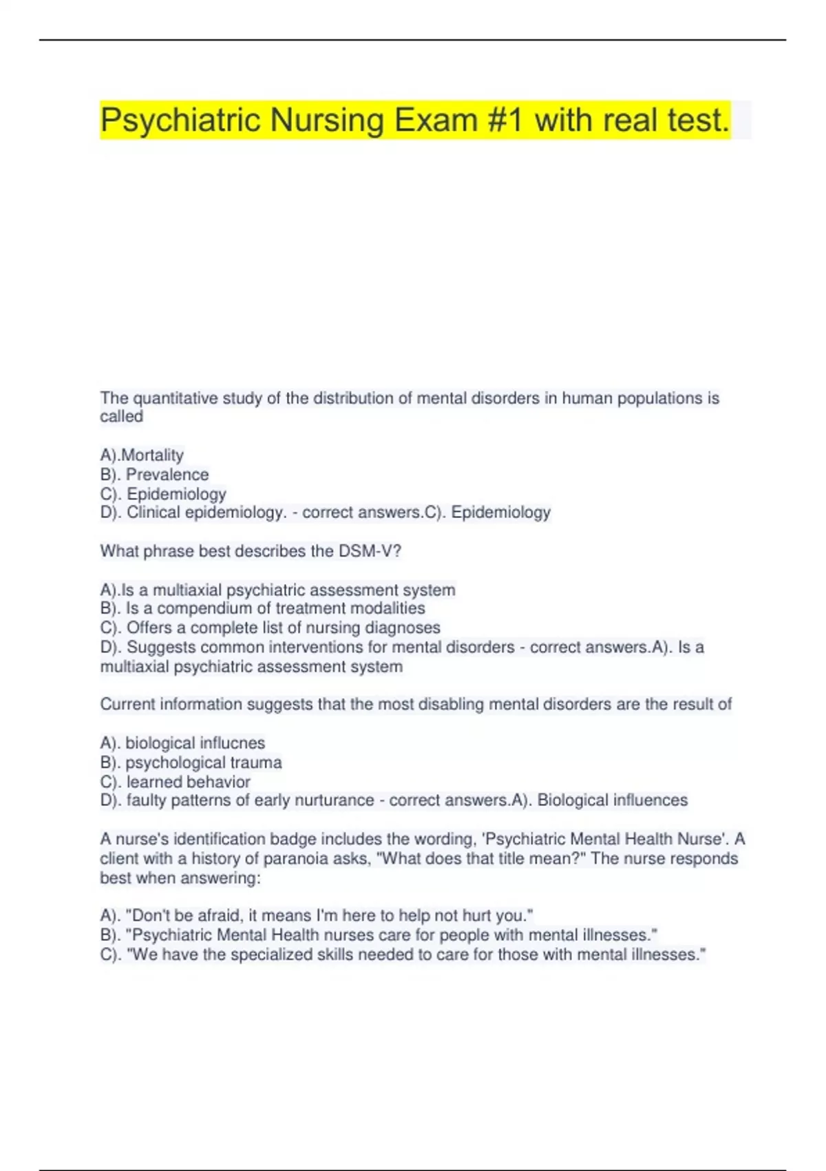 Psychiatric Nursing Exam #1 with real test. The quantitative study of the distribution of mental disorders in human populations is called A).Mortality B). Prevalence C). Epidemiology D). Clinical epidemiology. - correct answers.C). Epidemiology What phrase best describes the DSM-V? A).Is a multiaxial psychiatric assessment system B). Is a compendium of treatment modalities C). Offers a complete list of nursing diagnoses D). Suggests common interventions for mental disorders - correct answers.A). Is a multiaxial psychiatric assessment system Current information suggests that the most disabling mental disorders are the result of A). biological influcnes B). psychological trauma C). learned behavior D). faulty patterns of early nurturance - correct answers.A). Biological influences A nurse's identification badge includes the wording, 'Psychiatric Mental Health Nurse'. A client with a history of paranoia asks, "What does that title mean?" The nurse responds best when answering: A). "Don't be afraid, it means I'm here to help not hurt you." B). "Psychiatric Mental Health nurses care for people with mental illnesses." C). "We have the specialized skills needed to care for those with mental illnesses." D). "The nurses who work in mental health facilities have that title." - correct answers.C). we have specialized skills needed to care for those with mental illness Regarding individuals with mental disorders, distress refers to a painful symptom, and disability refers to A). the presence of deviant behavior B). impairment in important areas of functioning C). culturally appropriate responses to an event D). a conflict between the individual and society - correct answers.B). impairment in important areas of functioning Which statement best describes the DSM-5? A). It is a medical psychiatric assessment system B). it is a compendium of treatment modaliies C). It offers a complete list of nursing diagnoses D). it suggests common interventions for mental disorders - correct answers.A). it is a medical psychiatric assessment Which statement about diagnosis of a mental disorder is true? A). The symptoms of each disorder are common among all cultures. B).Culture may cause variations in symptoms for each clinical disorder. C). All mental disorders listed in the DSM-5 are seen in all other cultures. D). Psychiatric diagnoses are listed in separately from other physical disorders in a five axes system. - correct answers.B). culture may cause variations in symptoms for each clinical disorder The prevalence rate over a 12-month period for major depressive disorder is A). lower than the prevalence rate for panic disorders B). greater than the prevalence rate for psychotic disorders. C). equal to the prevalence rate for psychotic disorders D). greater than the prevalence rate for generalized anxiety - correct answers.D). greater than the prevalence rate for generalized anxiety These severe mental illnesses are recognized across cultures: A). antisocial and borderline personality disorders. B). schizophrenia and bipolar disorder C). bulimia and anorexia nervosa D). amok and social phobia - correct answers.B). schizophrenia and bipolar disorder An important difference between the developmental theories of Freud and Erikson is A). Freud considers the entire lifespan from birth to old age B). Freud focuses to a greater extent on cognitive development C). Erikson viewed individual growth in terms of social setting D).Eriksin focuses on development of individual moral thinking - correct answers.C). Erikson viewed individual growth in terms of social setting Maslow's theory of Humanistic Psychology has provided nursing with a framework for A). Holistic assessment B). determining moral development C). identifying potential for success in therapy D). conducting nurse-client interpersonal interactions - correct answers.A). holistic assessment The premise underlying behavioral therapy is A). behavior is learned and can be modified B). behavior is a product of unconscious drives C). motives must change before behavior changes D). behavior is determined by cognition. change in cognitions produces behavior - correct answers.A). Behavior is learned and can be modified The nurse planning care for a 14-year-old needs to take into account that the developmental task of adolescence is to A). establish trust B). gain autonomy C). achieve identity D).develop a sense of industry - correct answers.C). achieve indentity Sullivan viewed anxiety as A). emotional experience felt after the age of 5 years B). a sign of guilt in adults C) .any painful feeling or emotion arising from social insecurity D). adults trying to go beyond experiences of guilt and pain - correct answers.C). any painful feeling or emotion arising from social insecurity Which statement best clarifies the difference between the art and the science of nursing? A). The art is the care, compassion, and advocacy component, and the science is the applied knowledge base. B). The art is the way in which knowledge is applied, and the science is the technological aspects of caregiving.