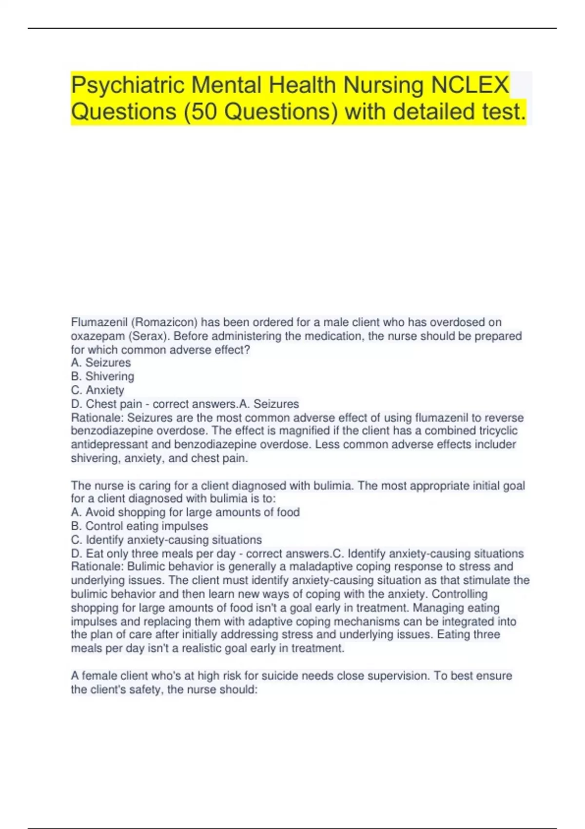 Psychiatric Mental Health Nursing NCLEX Questions (50 Questions) with detailed test. Flumazenil (Romazicon) has been ordered for a male client who has overdosed on oxazepam (Serax). Before administering the medication, the nurse should be prepared for which common adverse effect? A. Seizures B. Shivering C. Anxiety D. Chest pain - correct answers.A. Seizures Rationale: Seizures are the most common adverse effect of using flumazenil to reverse benzodiazepine overdose. The effect is magnified if the client has a combined tricyclic antidepressant and benzodiazepine overdose. Less common adverse effects includer shivering, anxiety, and chest pain. The nurse is caring for a client diagnosed with bulimia. The most appropriate initial goal for a client diagnosed with bulimia is to: A. Avoid shopping for large amounts of food B. Control eating impulses C. Identify anxiety-causing situations D. Eat only three meals per day - correct answers.C. Identify anxiety-causing situations Rationale: Bulimic behavior is generally a maladaptive coping response to stress and underlying issues. The client must identify anxiety-causing situation as that stimulate the bulimic behavior and then learn new ways of coping with the anxiety. Controlling shopping for large amounts of food isn't a goal early in treatment. Managing eating impulses and replacing them with adaptive coping mechanisms can be integrated into the plan of care after initially addressing stress and underlying issues. Eating three meals per day isn't a realistic goal early in treatment. A female client who's at high risk for suicide needs close supervision. To best ensure the client's safety, the nurse should: A. Check on the client frequently at irregular intervals throughout the night B. Assure the client that the nurse will hold in confidence anything the client says C. Repeatedly discuss previous suicide attempts with the client D. Disregard decreased communication by the client because this is common in suicidal clients - correct answers.A. Check on the client frequently at irregular intervals throughout the night Rationale: Checking the client frequently but at irregular intervals prevents the client from predicting when observation will take place and altering behavior in a misleading way at these times. Option B may encourage the client to try to manipulate the nurse's or seek attention for having a secret suicide plan. Option C may reinforce a suicidal idea. Decreased communication is a sign of withdrawal that may indicate the client has decided to commit suicide; the nurse shouldn't disregard it. Which of the following drugs should the nurse prepare to administer to a client with a toxic acetaminophen (Tylenol) level? A. deferoxamine mesylate B. succimer (Chemet) C. flumazenil (Romazicon) D. acetylcysteine (Mucomyst) - correct answers.D. acetylcysteine (Mucomyth) Rationale: The antidote for acetaminophen toxicity is acetylcysteine. It enhances conversion of toxic metabolites to nontoxic metabolites. Deferoxamine meslyate is the antidote for iron intoxication. Succimer is an antidote for lead poisoning. Flumazenil reverses the sedative effects of benzodiazepines. A male client is admitted to the substance abuse unit for alcohol detoxification. Which of the following medications is the nurse likely to administer to reduce the symptoms of alcohol withdrawal? A. naloxone (Narcan) B. haloperidol (Haldol) C. magnesium sulfate D. chlordiazepoxide (Librium) - correct answers.D. clordiazepoxide (Librium) Rationale: Chlordiazepoxide (Librium) and other tranquilizers help reduce the symptoms of alcohol withdrawal. Haloperidol (Haldol) may be given to treat clients with psychosis, severe agitation, or delirium. Naloxone (Narcan) is administered for narcotic overdose. Magnesium sulfate and other anticonvulsant medications are only administer to treat seizures if they occur during the withdrawal. During postprandial monitor, a female client with bulimia nervosa tells the nurse, "You can sit with me, but you're just wasting your time. After you sat with me yesterday, I was still able to purge. Today, my goal is to do it twice." What is the nurse's BEST responses? A. "I trust you not to purge." B. "How are you purging and when do you do it?" C. "Don't worry. I won't allow you to purge today." D. "I know it's important for you to feel in control, but I'll monitor you for 90 minutes after you eat." - correct answers.D. "I know it's important for you to feel in control, but I'll monitor you for 90 minutes after you eat." Rationale: This response acknowledges that the clients is testing limits and that the nurse is setting them by performing postprandial monitoring to prevent self-induced eyes is. Clients with bulimia nervosa need to feel in control of the diet because they feel they lack control over all other aspects of their lives. Because their therapeutic relationships with caregivers are less important than their need to purge, they don't fear betraying the nurse's trust by engaging in the activity. They commonly plot purging and rarely share their secrets about it. An authoritarian or challenging response may trigger a power struggle between the nurse and client. A male client admitted to the psychiatric unit for treatment of substance abuse says to the nurse, "It felt so wonderful to get high." Which of the following is the most appropriate response? A. "If you continue to talk like that, I'm going to stop speaking to you." B. "You told me you got fired from your past job for missing too may days after taking drugs all night." C. "Tell me more about how it felt to get high." D. "Don't you know it's illegal to use drugs?" - correct answers.B. "You told me you got fired from your past job for missing too many days after taking drugs all night." Rationale: Confronting the client with the consequences of substance abuse helps to break through denial. Making threats (option A) isn't an effective way to promote self-disclosure or establish a rapport with