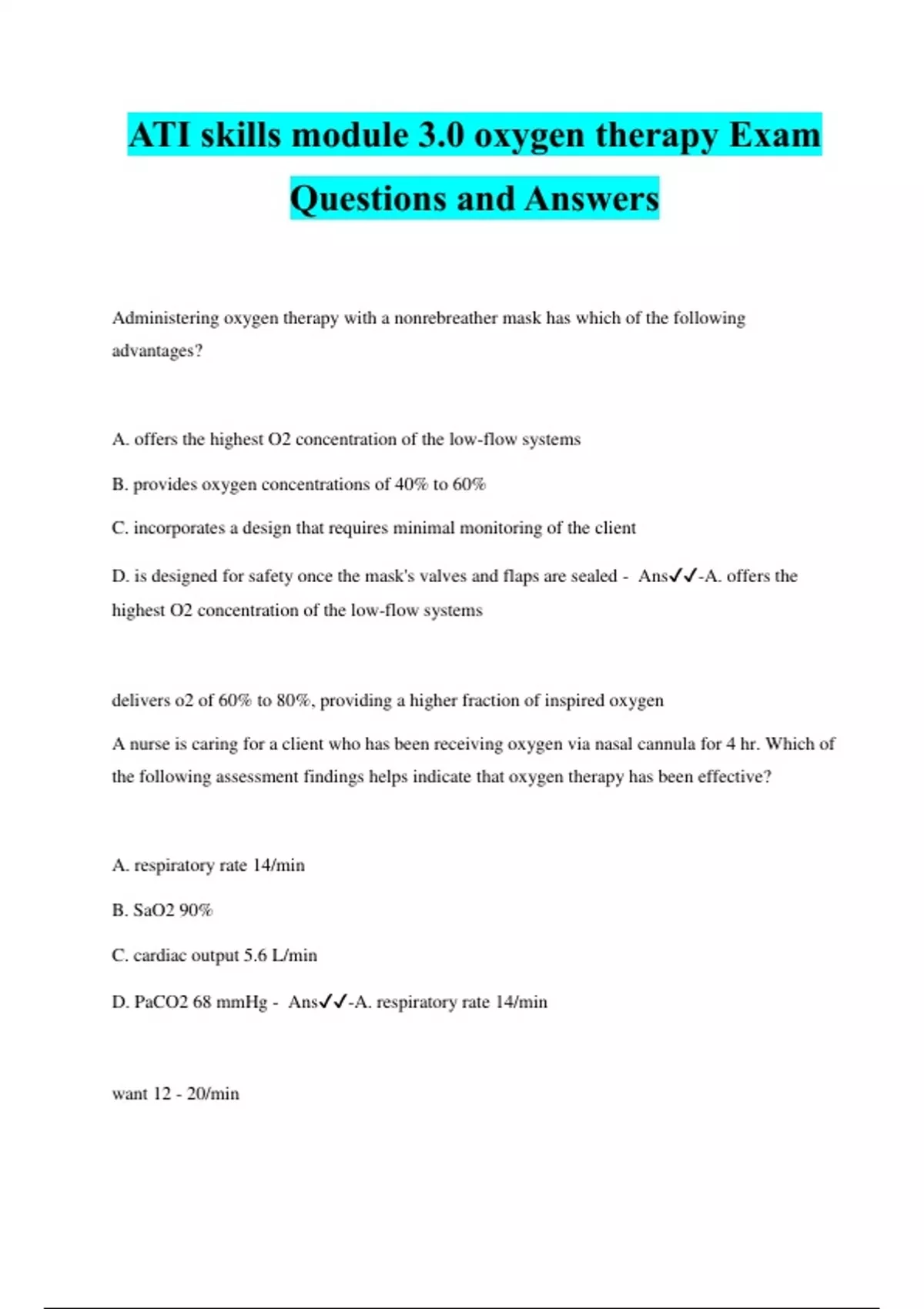 ATI skills module 3.0 oxygen therapy Exam Questions and Answers Administering oxygen therapy with a nonrebreather mask has which of the following advantages? A. offers the highest O2 concentration of the low-flow systems B. provides oxygen concentrations of 40% to 60% C. incorporates a design that requires minimal monitoring of the client D. is designed for safety once the mask's valves and flaps are sealed - Ans️️ -A. offers the highest O2 concentration of the low-flow systems delivers o2 of 60% to 80%, providing a higher fraction of inspired oxygen A nurse is caring for a client who has been receiving oxygen via nasal cannula for 4 hr. Which of the following assessment findings helps indicate that oxygen therapy has been effective? A. respiratory rate 14/min B. SaO2 90% C. cardiac output 5.6 L/min D. PaCO2 68 mmHg - Ans️️ -A. respiratory rate 14/min want 12 - 20/min A nurse is caring for a client who has dyspnea, slight cyanosis, and a respiratory rate of 28/min. During which of the following phases of the nursing process with the nurse determine the client has impaired gas exchange? A. assessment B. diagnosis C. planning D. evaluation - Ans️️ -B. diagnosi