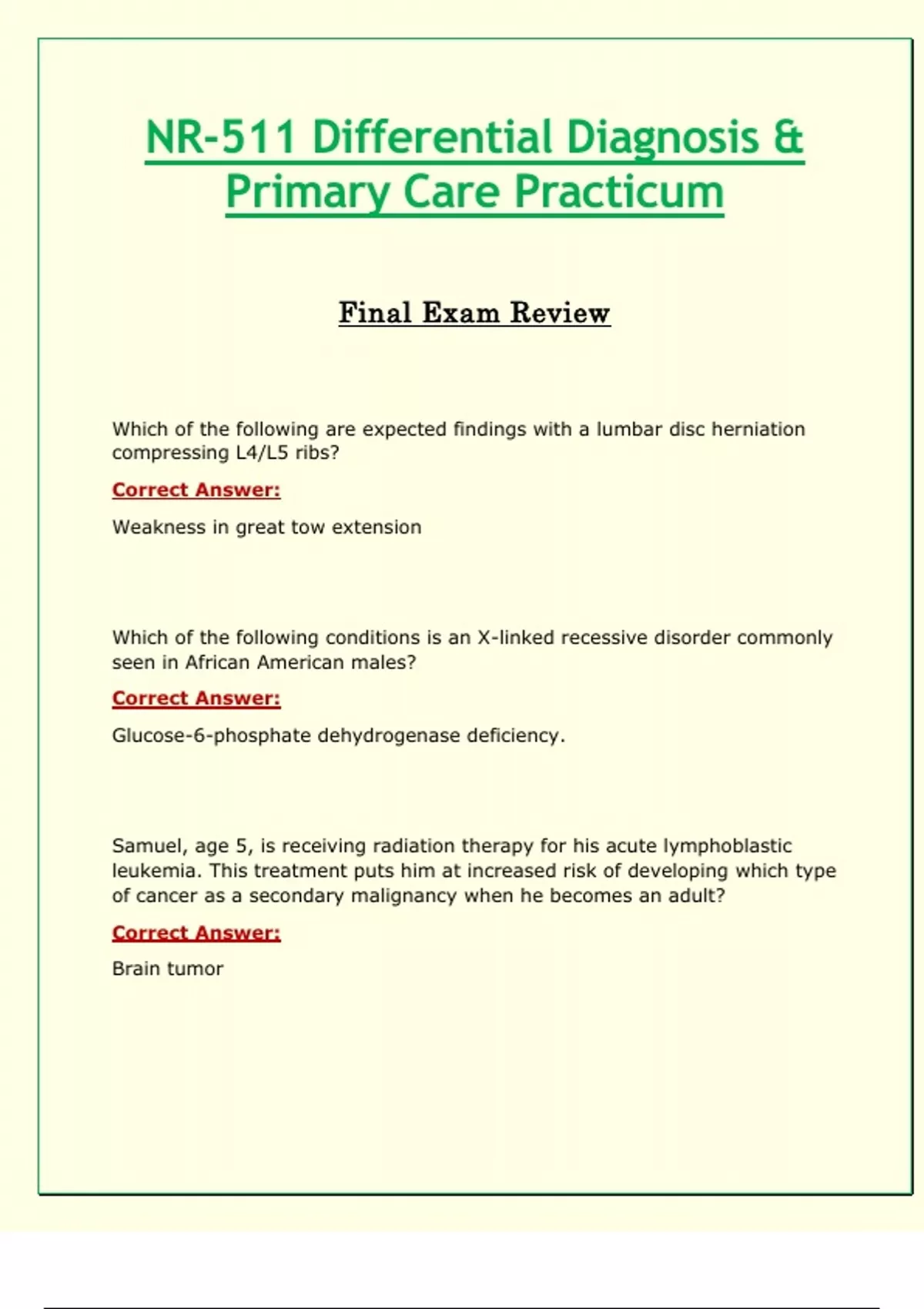 NR511 / NR 511 Final Exam Review (Latest 2024 / 2025): Differential Diagnosis & Primary Care Practicum - Chamberlain