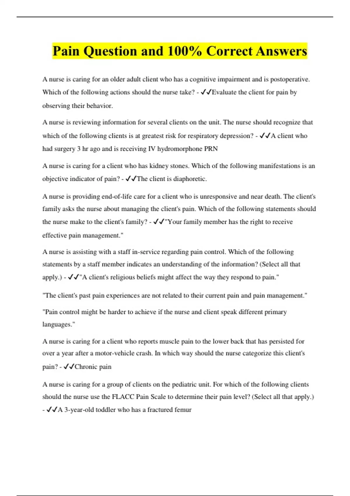 A nurse is caring for an older adult client who has a cognitive impairment and is postoperative. Which of the following actions should the nurse take? - Evaluate the client for pain by observing their behavior. A nurse is reviewing information for several clients on the unit. The nurse should recognize that which of the following clients is at greatest risk for respiratory depression? - A client who had surgery 3 hr ago and is receiving IV hydromorphone PRN A nurse is caring for a client who has kidney stones. Which of the following manifestations is an objective indicator of pain? - The client is diaphoretic. A nurse is providing end-of-life care for a client who is unresponsive and near death. The client's family asks the nurse about managing the client's pain. Which of the following statements should the nurse make to the client's family? - "Your family member has the right to receive effective pain management."