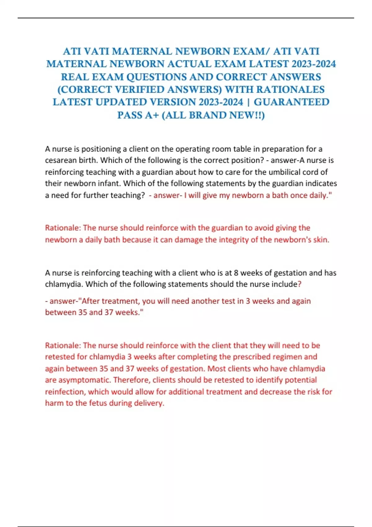 ATI VATI MATERNAL NEWBORN EXAM/ ATI VATI MATERNAL NEWBORN ACTUAL EXAM LATEST REAL EXAM QUESTIONS AND CORRECT ANSWERS (CORRECT VERIFIED ANSWERS) WITH RATIONALES LATEST UPDATED VERSION | GUARANTEED PASS A+ (ALL BRAND NEW!!)