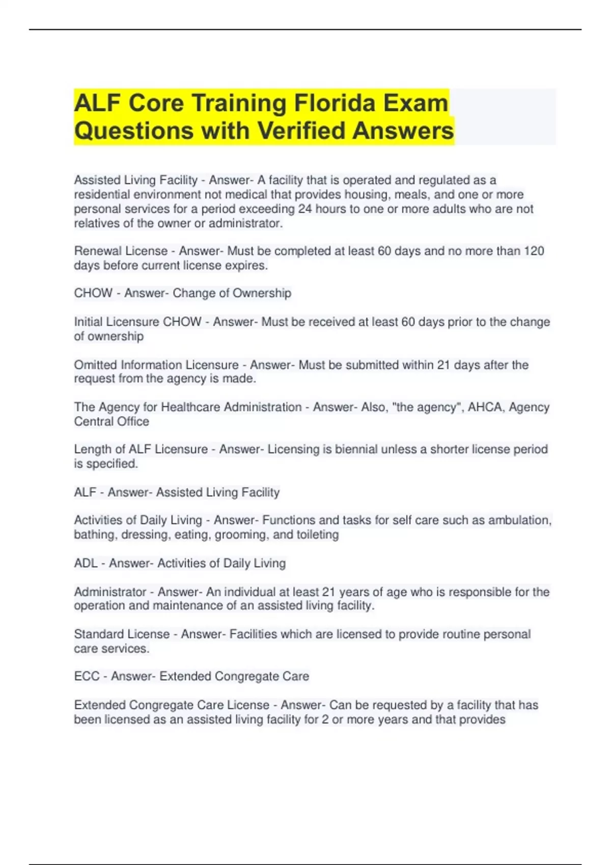 ALF Core Training Florida Exam Questions with Verified Answers