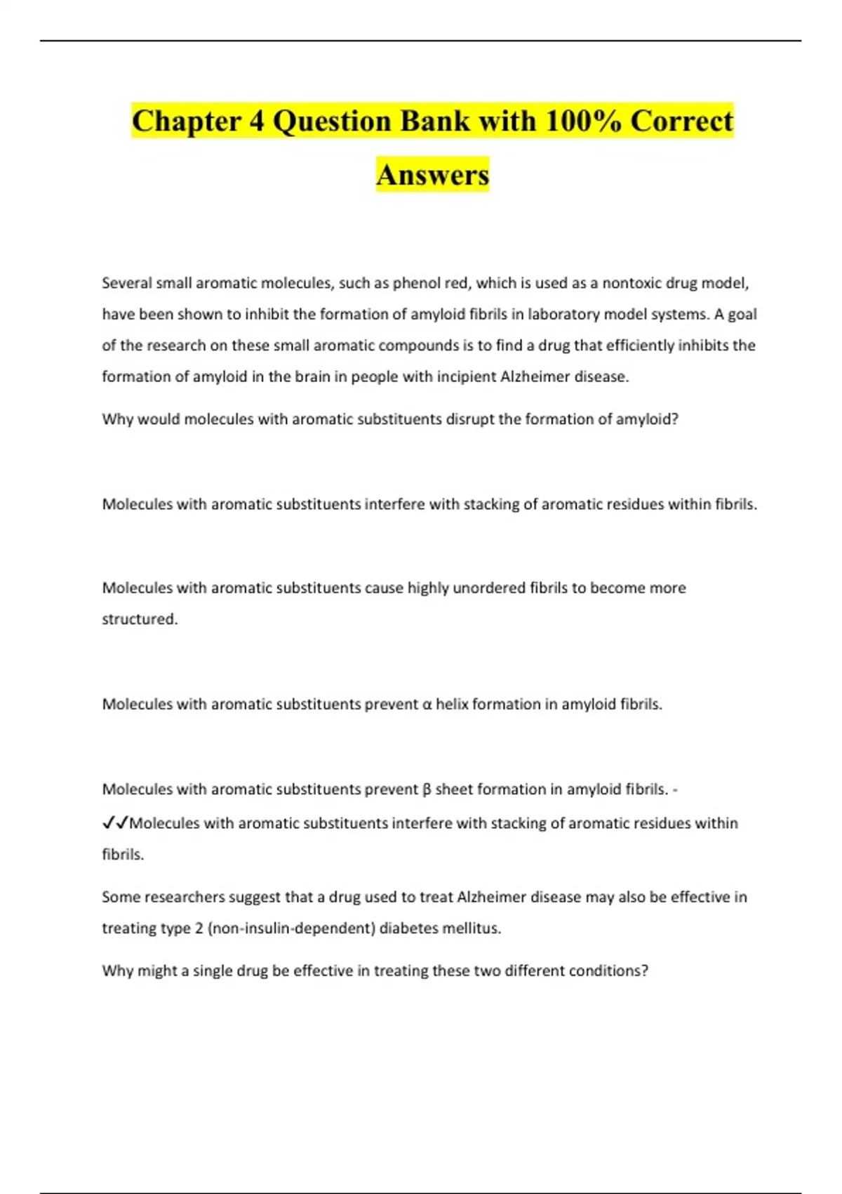 Several small aromatic molecules, such as phenol red, which is used as a nontoxic drug model, have been shown to inhibit the formation of amyloid fibrils in laboratory model systems. A goal of the research on these small aromatic compounds is to find a drug that efficiently inhibits the formation of amyloid in the brain in people with incipient Alzheimer disease. Why would molecules with aromatic substituents disrupt the formation of amyloid? Molecules with aromatic substituents interfere with stacking of aromatic residues within fibrils. Molecules with aromatic substituents cause highly unordered fibrils to become more structured. Molecules with aromatic substituents prevent α helix formation in amyloid fibrils. Molecules with aromatic substituents prevent β sheet formation in amyloid fibrils. - Molecules with aromatic substituents interfere with stacking of aromatic residues within fibrils. Some researchers suggest that a drug used to treat Alzheimer disease may also be effective in treating type 2 (non-insulin-dependent) diabetes mellitus. Why might a single drug be effective in treating these two different conditions?