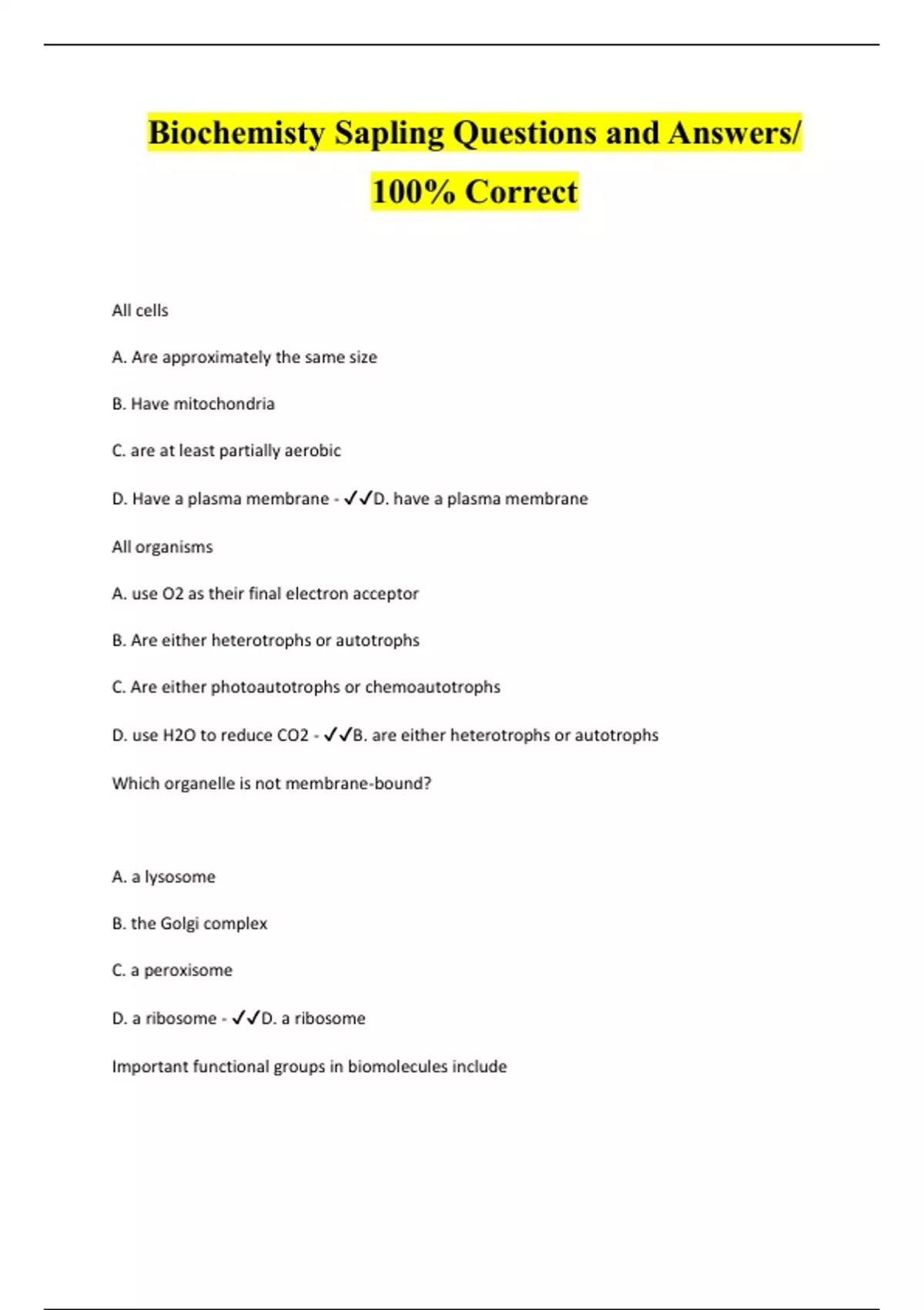 All cells A. Are approximately the same size B. Have mitochondria C. are at least partially aerobic D. Have a plasma membrane - D. have a plasma membrane All organisms A. use O2 as their final electron acceptor B. Are either heterotrophs or autotrophs C. Are either photoautotrophs or chemoautotrophs D. use H2O to reduce CO2 - B. are either heterotrophs or autotrophs Which organelle is not membrane-bound? A. a lysosome B. the Golgi complex C. a peroxisome D. a ribosome - D. a ribosome Important functional groups in biomolecules include A. carbons B. nucleic acids C. lipids D. thioesters - D. thioesters Enantiomers A. can exist for molecules with more than one chiral carbon B. are only associated with amino acids C. are always designed either D or L D. can be specific types of diastereomers - A. can exist for molecules with more than one chiral carbon Metabolites are small molecules