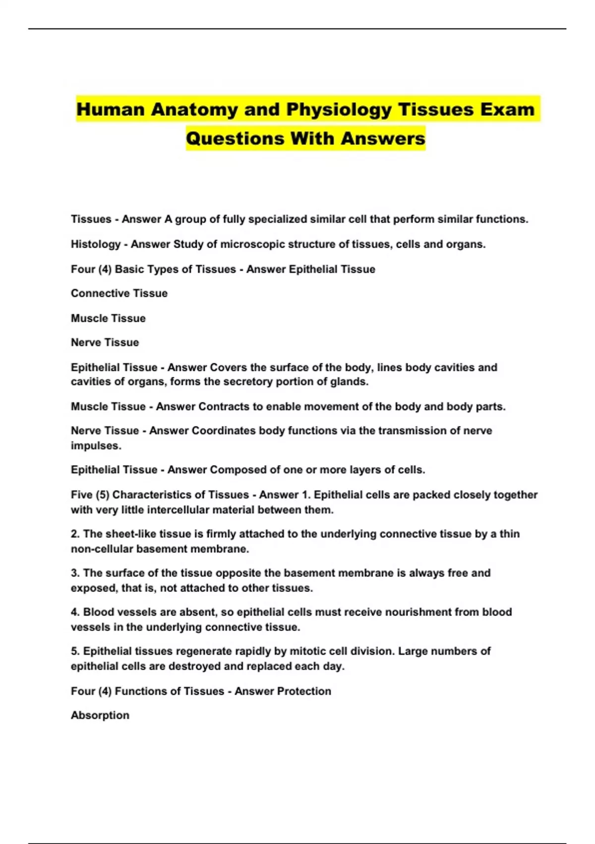 Human Anatomy and Physiology Tissues Exam Questions With Answers...