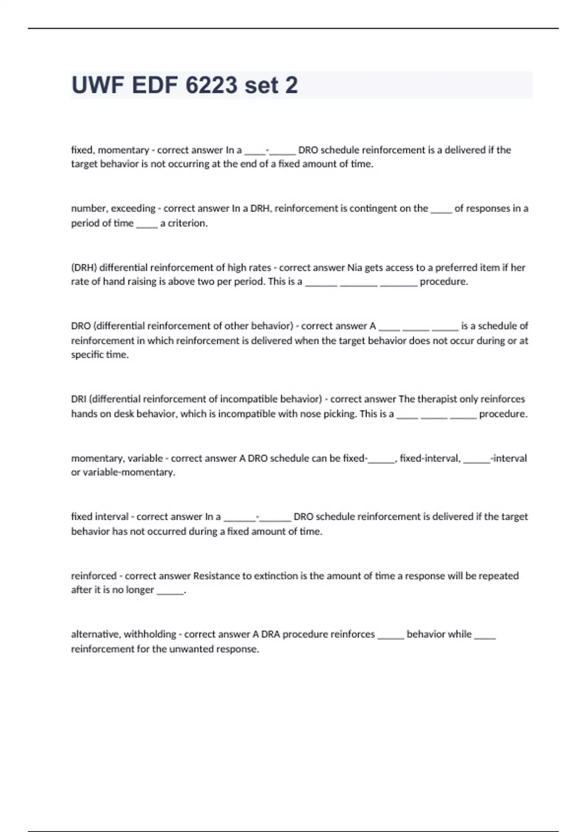 UWF EDF 6223 set 2 fixed, momentary - correct answer In a ____-_____ DRO schedule reinforcement is a delivered if the target behavior is not occurring at the end of a fixed amount of time. number, exceeding - correct answer In a DRH, reinforcement is contingent on the ____ of responses in a period of time ____ a criterion. (DRH) differential reinforcement of high rates - correct answer Nia gets access to a preferred item if her rate of hand raising is above two per period. This is a ______ _______ _______ procedure. DRO (differential reinforcement of other behavior) - correct answer A ____ _____ _____ is a schedule of reinforcement in which reinforcement is delivered when the target behavior does not occur during or at specific time. DRI (differential reinforcement of incompatible behavior) - correct answer The therapist only reinforces hands on desk behavior, which is incompatible with nose picking. This is a ____ _____ _____ procedure. momentary, variable - correct answer A DRO schedule can be fixed-_____, fixed-interval, _____-interval or variable-momentary. fixed interval - correct answer In a ______-______ DRO schedule reinforcement is delivered if the target behavior has not occurred during a fixed amount of time. reinforced - correct answer Resistance to extinction is the amount of time a response will be repeated after it is no longer _____. alternative, withholding - correct answer A DRA procedure reinforces _____ behavior while ____ reinforcement for the unwanted response.