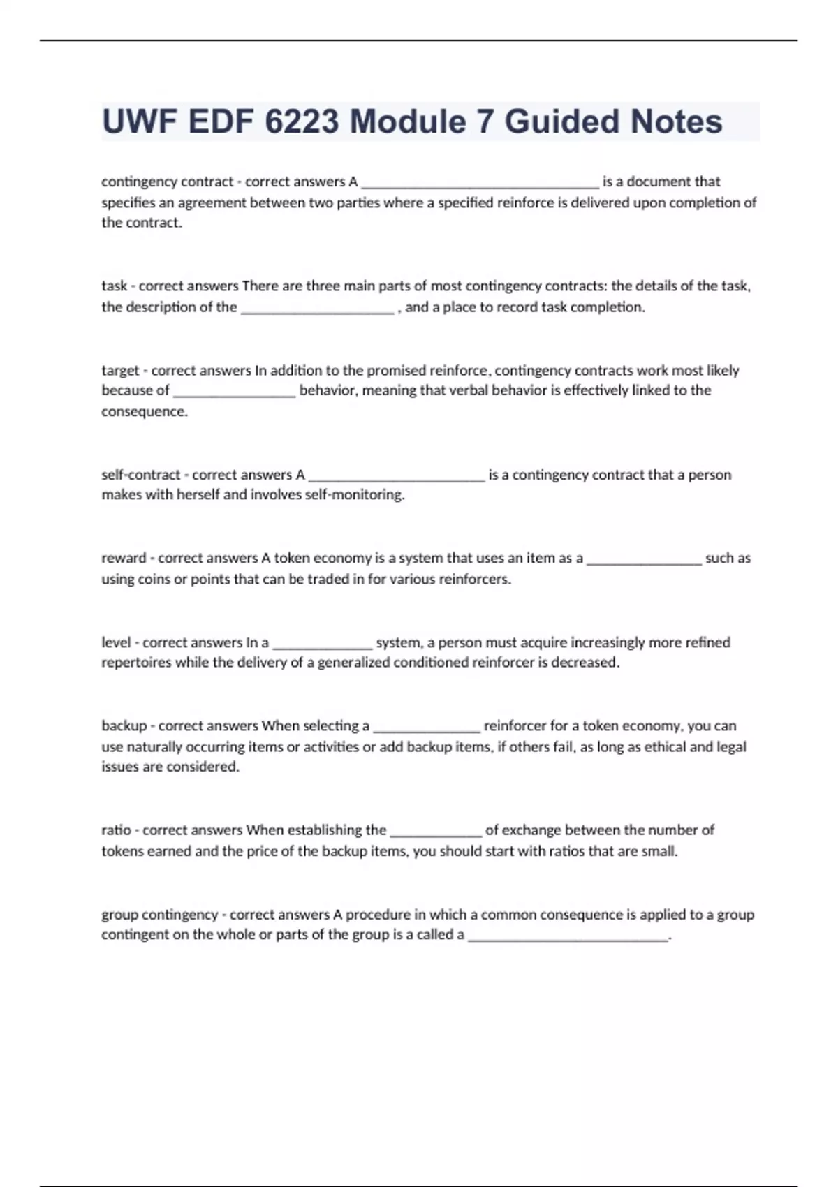 UWF EDF 6223 Module 7 Guided Notescontingency contract - correct answers A _______________________________ is a document that specifies an agreement between two parties where a specified reinforce is delivered upon completion of the contract. task - correct answers There are three main parts of most contingency contracts: the details of the task, the description of the ____________________ , and a place to record task completion. target - correct answers In addition to the promised reinforce, contingency contracts work most likely because of ________________ behavior, meaning that verbal behavior is effectively linked to the consequence. self-contract - correct answers A _______________________ is a contingency contract that a person makes with herself and involves self-monitoring. reward - correct answers A token economy is a system that uses an item as a _______________ such as using coins or points that can be traded in for various reinforcers. level - correct answers In a _____________ system, a person must acquire increasingly more refined repertoires while the delivery of a generalized conditioned reinforcer is decreased. backup - correct answers When selecting a ______________ reinforcer for a token economy, you can use naturally occurring items or activities or add backup items, if others fail, as long as ethical and legal issues are considered. ratio - correct answers When establishing the ____________ of exchange between the number of tokens earned and the price of the backup items, you should start with ratios that are small. group contingency - correct answers A procedure in which a common consequence is applied to a group contingent on the whole or parts of the group is a called a __________________________.