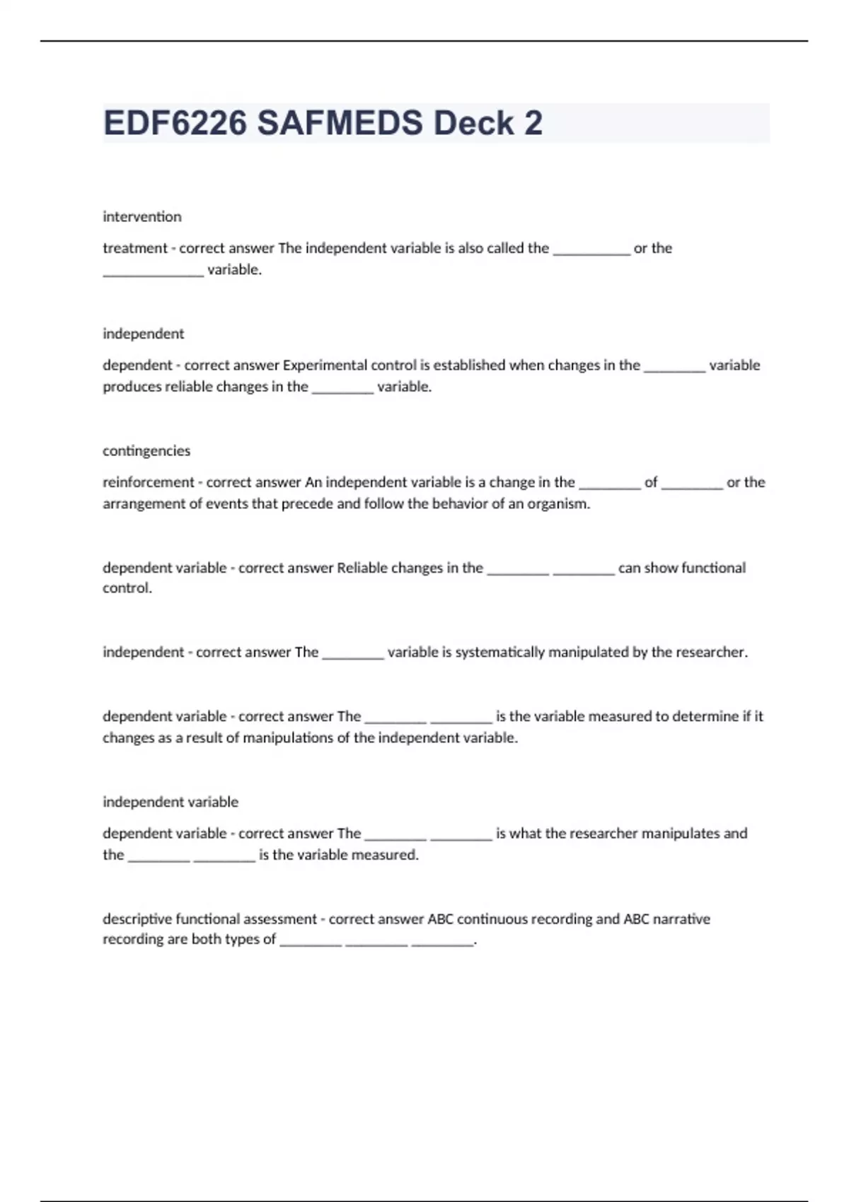 EDF6226 SAFMEDS Deck 2intervention treatment - correct answer The independent variable is also called the __________ or the _____________ variable. independent dependent - correct answer Experimental control is established when changes in the ________ variable produces reliable changes in the ________ variable. contingencies reinforcement - correct answer An independent variable is a change in the ________ of ________ or the arrangement of events that precede and follow the behavior of an organism. dependent variable - correct answer Reliable changes in the ________ ________ can show functional control. independent - correct answer The ________ variable is systematically manipulated by the researcher. dependent variable - correct answer The ________ ________ is the variable measured to determine if it changes as a result of manipulations of the independent variable. independent variable dependent variable - correct answer The ________ ________ is what the researcher manipulates and the ________ ________ is the variable measured. descriptive functional assessment - correct answer ABC continuous recording and ABC narrative recording are both types of ________ ________ ________.