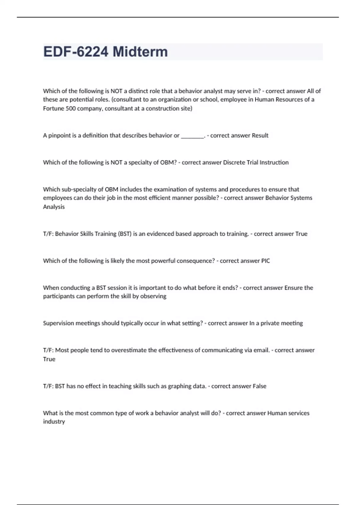 EDF-6224 MidtermWhich of the following is NOT a distinct role that a behavior analyst may serve in? - correct answer All of these are potential roles. (consultant to an organization or school, employee in Human Resources of a Fortune 500 company, consultant at a construction site) A pinpoint is a definition that describes behavior or _______. - correct answer Result Which of the following is NOT a specialty of OBM? - correct answer Discrete Trial Instruction Which sub-specialty of OBM includes the examination of systems and procedures to ensure that employees can do their job in the most efficient manner possible? - correct answer Behavior Systems Analysis T/F: Behavior Skills Training (BST) is an evidenced based approach to training. - correct answer True Which of the following is likely the most powerful consequence? - correct answer PIC When conducting a BST session it is important to do what before it ends? - correct answer Ensure the participants can perform the skill by observing Supervision meetings should typically occur in what setting? - correct answer In a private meeting T/F: Most people tend to overestimate the effectiveness of communicating via email. - correct answer True T/F: BST has no effect in teaching skills such as graphing data. - correct answer False What is the most common type of work a behavior analyst will do? - correct answer Human services industry