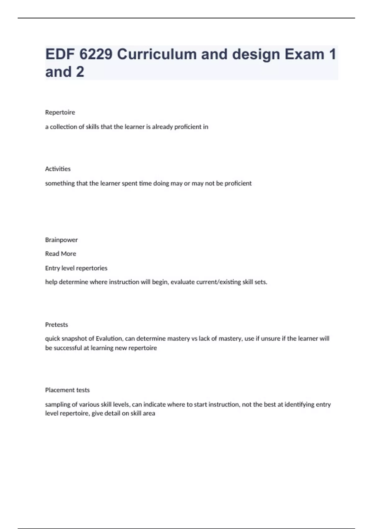 EDF 6229 Curriculum and design Exam 1 and 2 Repertoire a collection of skills that the learner is already proficient in Activities something that the learner spent time doing may or may not be proficient Brainpower Read More Entry level repertories help determine where instruction will begin, evaluate current/existing skill sets. Pretests quick snapshot of Evalution, can determine mastery vs lack of mastery, use if unsure if the learner will be successful at learning new repertoire Placement tests sampling of various skill levels, can indicate where to start instruction, not the best at identifying entry level repertoire, give detail on skill area