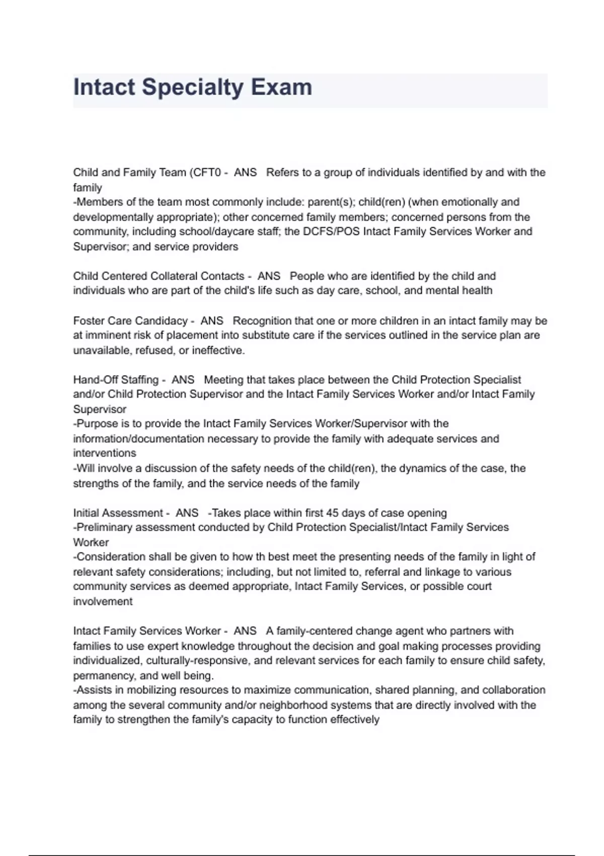 Intact Specialty Exam Questions And Answers Child and Family Team (CFT0 - ANS Refers to a group of individuals identified by and with the family -Members of the team most commonly include: parent(s); child(ren) (when emotionally and developmentally appropriate); other concerned family members; concerned persons from the community, including school/daycare staff; the DCFS/POS Intact Family Services Worker and Supervisor; and service providers Child Centered Collateral Contacts - ANS People who are identified by the child and individuals who are part of the child's life such as day care, school, and mental health Foster Care Candidacy - ANS Recognition that one or more children in an intact family may be at imminent risk of placement into substitute care if the services outlined in the service plan are unavailable, refused, or ineffective. Hand-Off Staffing - ANS Meeting that takes place between the Child Protection Specialist and/or Child Protection Supervisor and the Intact Family Services Worker and/or Intact Family Supervisor -Purpose is to provide the Intact Family Services Worker/Supervisor with the information/documentation necessary to provide the family with adequate services and interventions -Will involve a discussion of the safety needs of the child(ren), the dynamics of the case, the strengths of the family, and the service needs of the family Initial Assessment - ANS -Takes place within first 45 days of case opening -Preliminary assessment conducted by Child Protection Specialist/Intact Family Services Worker -Consideration shall be given to how th best meet the presenting needs of the family in light of relevant safety considerations; including, but not limited to, referral and linkage to various community services as deemed appropriate, Intact Family Services, or possible court involvement Intact Family Services Worker - ANS A family-centered change agent who partners with families to use expert knowledge throughout the decision and goal making processes providing individualized, culturally-responsive, and relevant services for each family to ensure child safety, permanency, and well being. -Assists in mobilizing resources to maximize communication, shared planning, and collaboration among the several community and/or neighborhood systems that are directly involved with the family to strengthen the family's capacity to function effectively