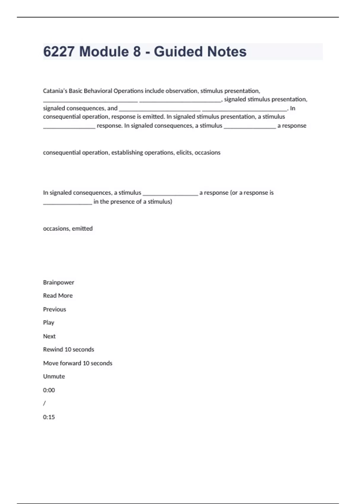 6227 Module 8 - Guided NotesCatania’s Basic Behavioral Operations include observation, stimulus presentation, _____________________________ _________________________, signaled stimulus presentation, signaled consequences, and _________________________ __________________________. In consequential operation, response is emitted. In signaled stimulus presentation, a stimulus ________________ response. In signaled consequences, a stimulus ________________ a response consequential operation, establishing operations, elicits, occasions In signaled consequences, a stimulus _________________ a response (or a response is _______________ in the presence of a stimulus) occasions, emitted Brainpower Read More Previous Play Next Rewind 10 seconds Move forward 10 seconds Unmute 0:00 / 0:15