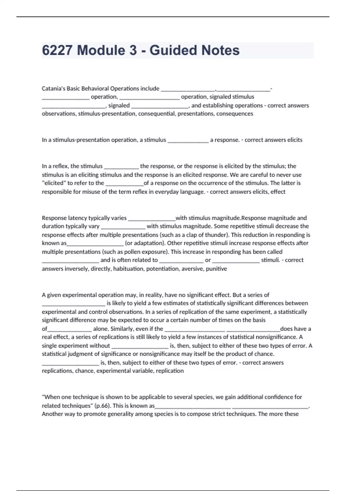 6227 Module 3 - Guided NotesCatania's Basic Behavioral Operations include _________________,_________________-_______________ operation, ___________________ operation, signaled stimulus ____________________, signaled __________________, and establishing operations - correct answers observations, stimulus-presentation, consequential, presentations, consequences In a stimulus-presentation operation, a stimulus _____________ a response. - correct answers elicits In a reflex, the stimulus ___________ the response, or the response is elicited by the stimulus; the stimulus is an eliciting stimulus and the response is an elicited response. We are careful to never use "elicited" to refer to the ____________of a response on the occurrence of the stimulus. The latter is responsible for misuse of the term reflex in everyday language. - correct answers elicits, effect Response latency typically varies _______________with stimulus magnitude.Response magnitude and duration typically vary ______________ with stimulus magnitude. Some repetitive stimuli decrease the response effects after multiple presentations (such as a clap of thunder). This reduction in responding is known as__________________ (or adaptation). Other repetitive stimuli increase response effects after multiple presentations (such as pollen exposure). This increase in responding has been called __________________ and is often related to ______________ or _______________ stimuli. - correct answers inversely, directly, habituation, potentiation, aversive, punitive A given experimental operation may, in reality, have no significant effect. But a series of ____________________ is likely to yield a few estimates of statistically significant differences between experimental and control observations. In a series of replication of the same experiment, a statistically significant difference may be expected to occur a certain number of times on the basis of______________ alone. Similarly, even if the ___________________ _________________does have a real effect, a series of replications is still likely to yield a few instances of statistical nonsignificance. A single experiment without __________________ is, then, subject to either of these two types of error. A statistical judgment of significance or nonsignificance may itself be the product of chance. __________________ is, then, subject to either of these two types of error. - correct answers replications, chance, experimental variable, replication "When one technique is shown to be applicable to several species, we gain additional confidence for related techniques" (p.66). This is known as________________________ ________________________. Another way to promote generality among species is to compose strict techniques. The more these