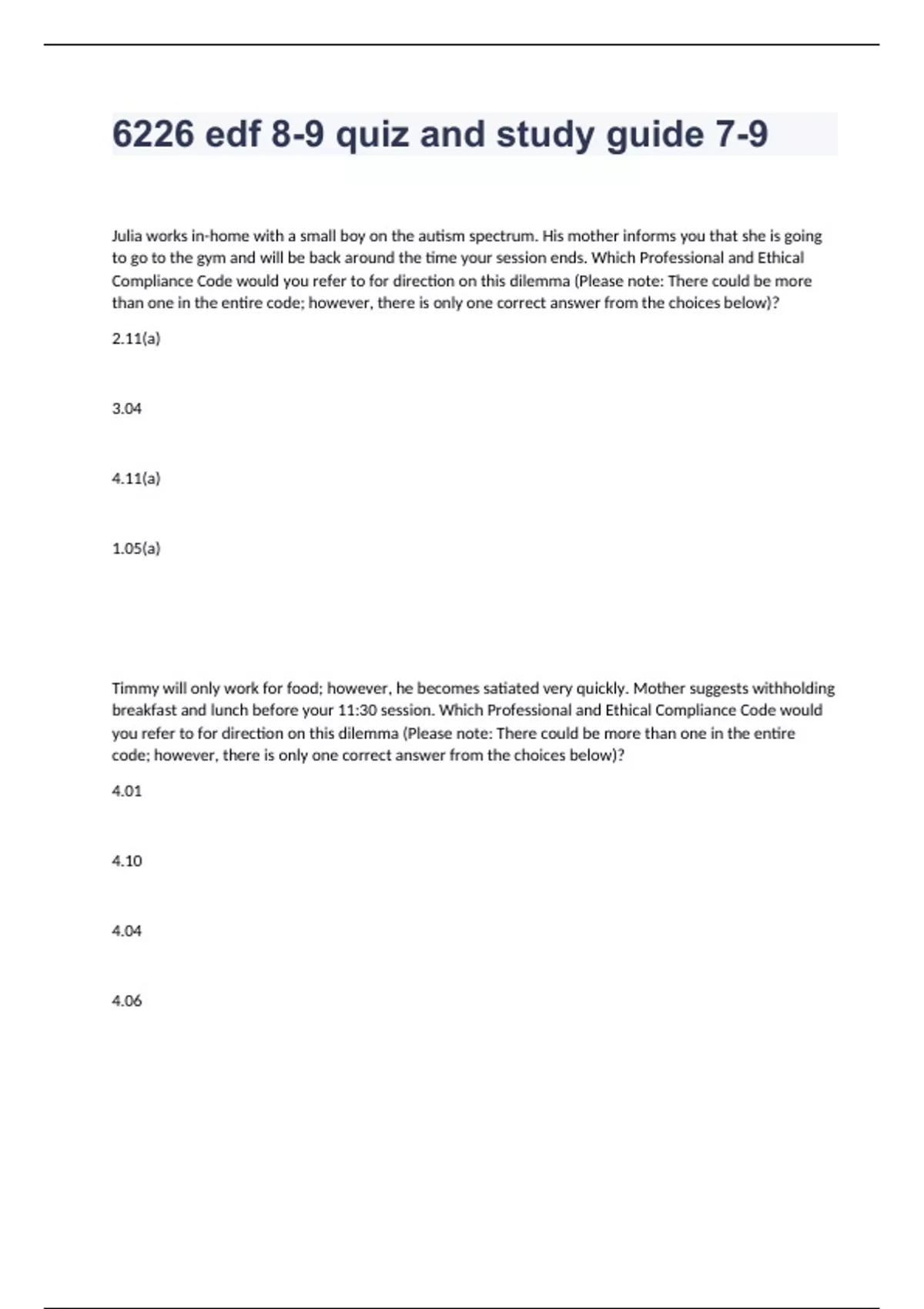 6226 edf 8-9 quiz and study guide 7-9Julia works in-home with a small boy on the autism spectrum. His mother informs you that she is going to go to the gym and will be back around the time your session ends. Which Professional and Ethical Compliance Code would you refer to for direction on this dilemma (Please note: There could be more than one in the entire code; however, there is only one correct answer from the choices below)? 2.11(a) 3.04 4.11(a) 1.05(a) Timmy will only work for food; however, he becomes satiated very quickly. Mother suggests withholding breakfast and lunch before your 11:30 session. Which Professional and Ethical Compliance Code would you refer to for direction on this dilemma (Please note: There could be more than one in the entire code; however, there is only one correct answer from the choices below)? 4.01 4.10 4.04 4.06