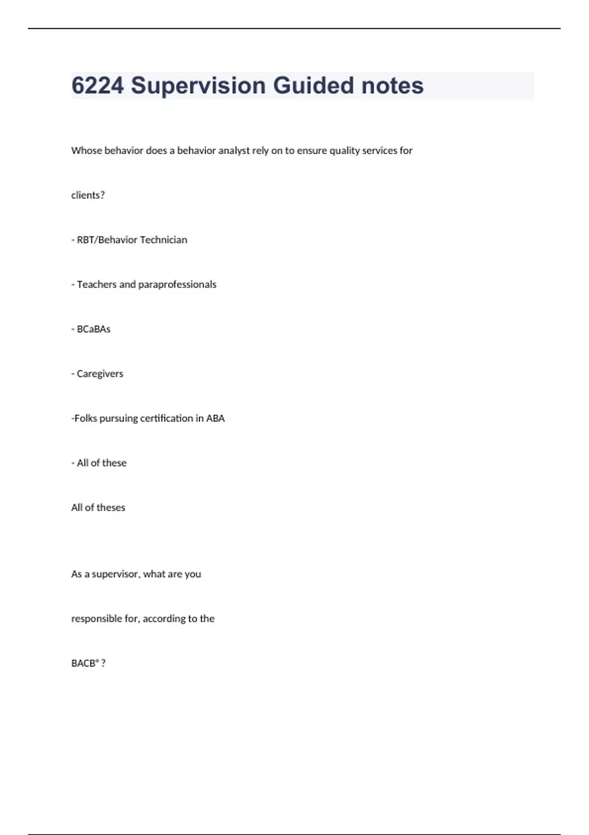 6224 Supervision Guided notesWhose behavior does a behavior analyst rely on to ensure quality services for clients? - RBT/Behavior Technician - Teachers and paraprofessionals - BCaBAs - Caregivers -Folks pursuing certification in ABA - All of these All of theses As a supervisor, what are you responsible for, according to the BACB®?